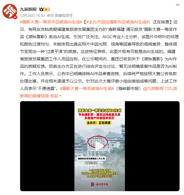摄影大赛一等奖作品被指AI生成从日本埼玉摄影沙龙撤奖到福建摄影大赛争议,AI生成图像正在冲击传统赛事规则。网友质疑《湖秋雾影》获奖合理性:“AI图获专业评委认可,是对摄影师的羞辱。”主办方虽明确禁止AI参赛,但公示期未主动筛查技术痕迹,暴露审核流程滞后。当技术门槛降低,艺术评判标准是否该增设“创作过程溯源”环节?