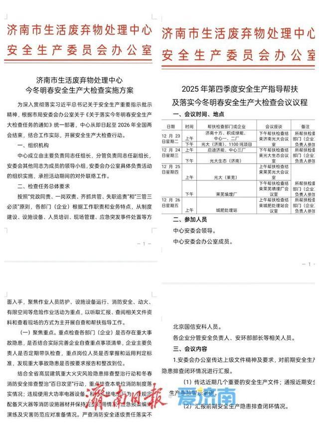 安全无小事,责任大于天。为切实扛起垃圾末端处置领域的安全政治责任,守护城市环境安全生命线,济南市生活废弃物处理中心安全生产委员会于12月23日至26日,启动了覆盖全域的第四季度安全生产指导帮扶暨今冬明春安全生产大检查。联合北京国信安科专家团队深入一线,以“最高标准、最严要求、最实举措”的硬作风,全面打响今冬明春安全防线守护战。