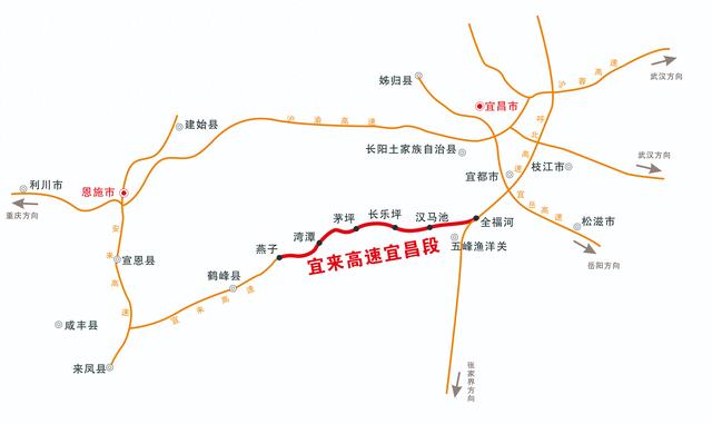 宜来高速宜昌段是省会放射线武汉至来凤高速的重要组成部分。项目起于宜都市姚家畈,对接已建成的呼北高速宜都至渔洋关段,止于五峰土家族自治县与恩施州鹤峰县交界的田家屋场附近。项目全长91.6公里,采用双向四车道标准建设,设计时速80公里/小时,桥隧比达73.4%。