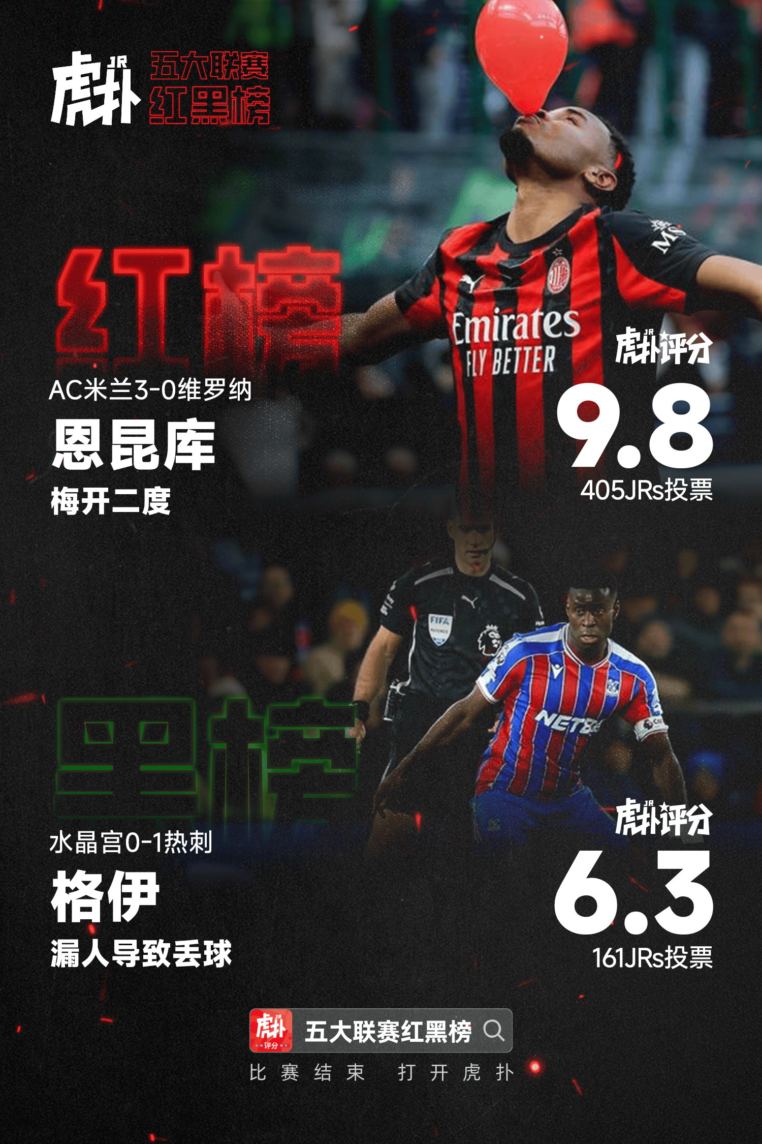 红榜方面,AC米兰恩昆库在比赛中上演梅开二度,帮助球队主场3-0战胜对手。