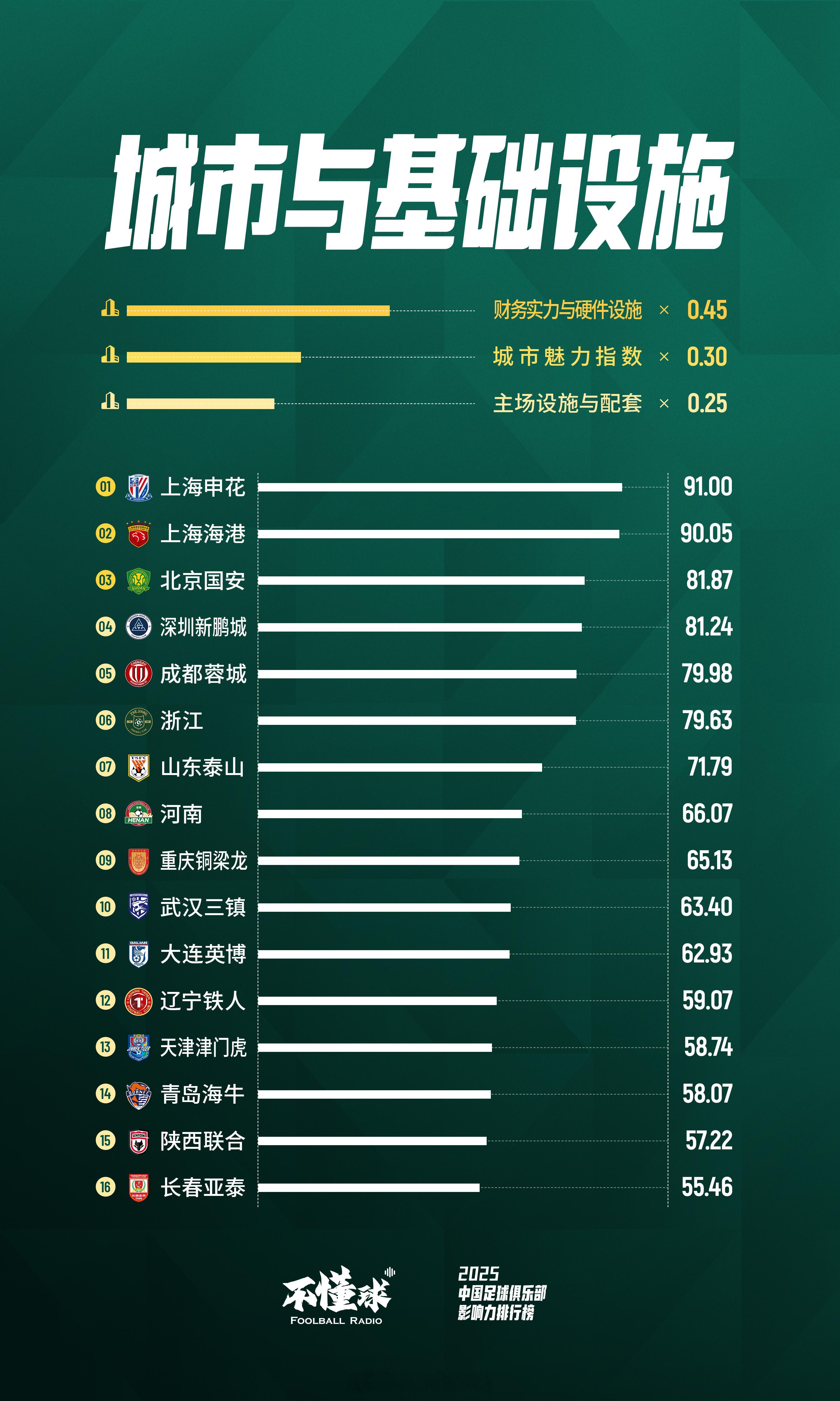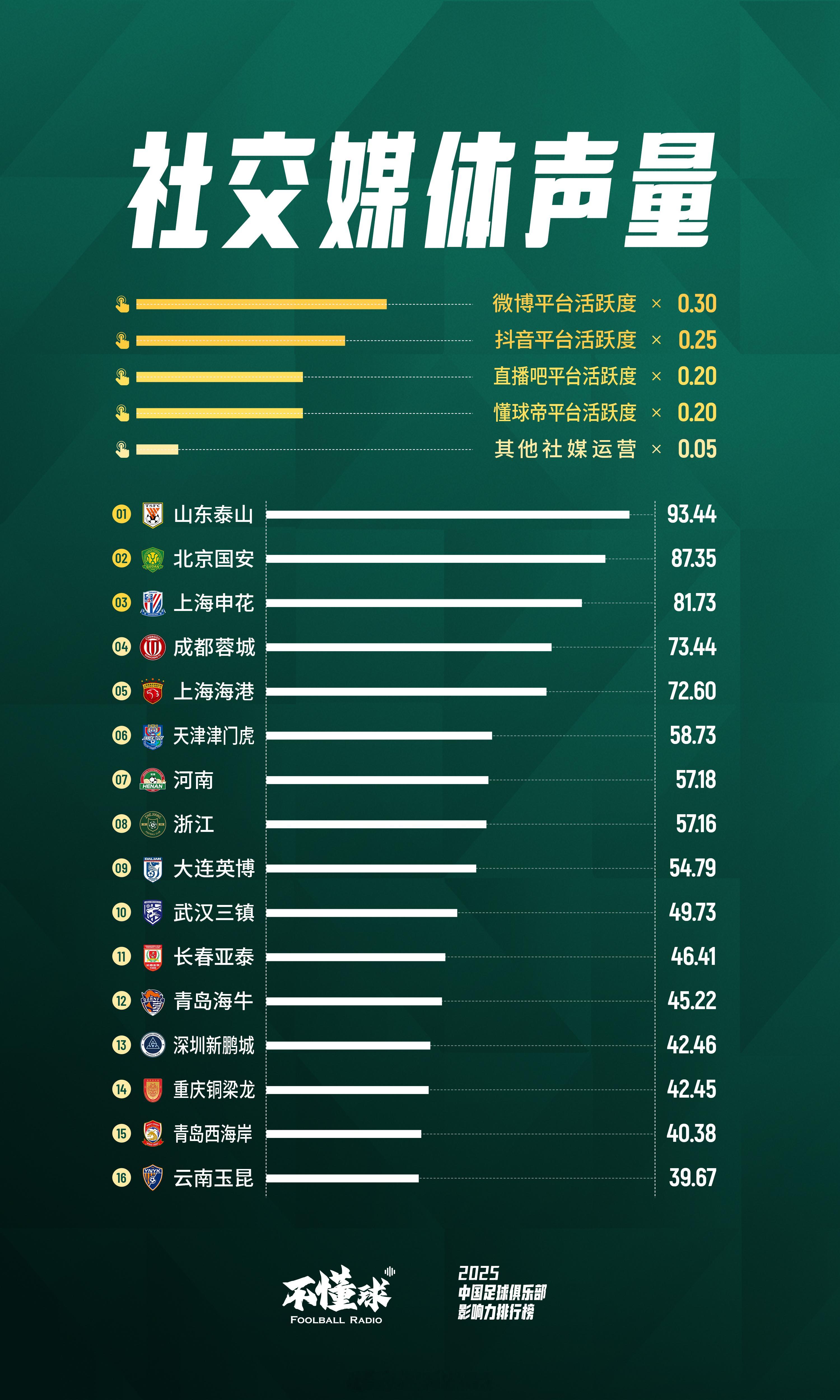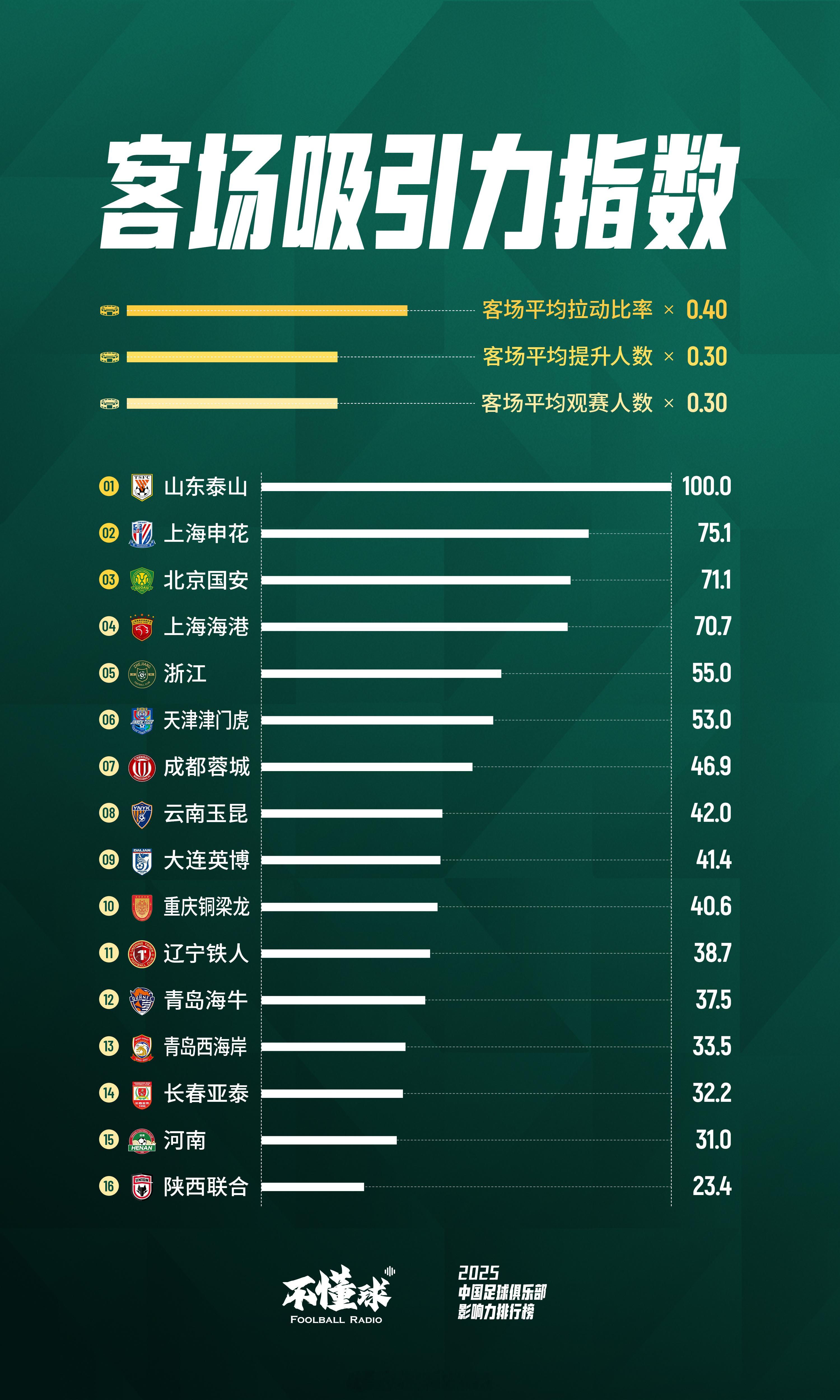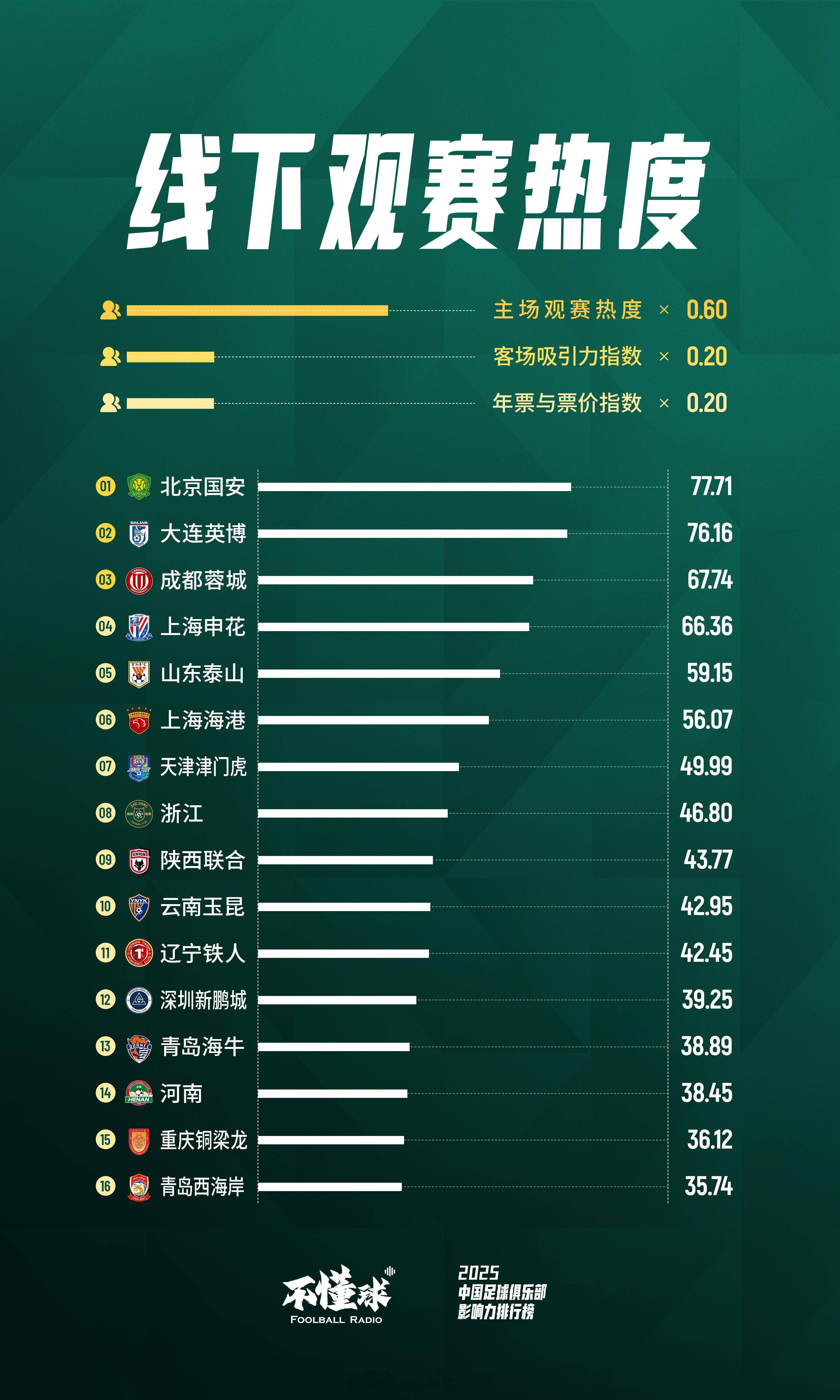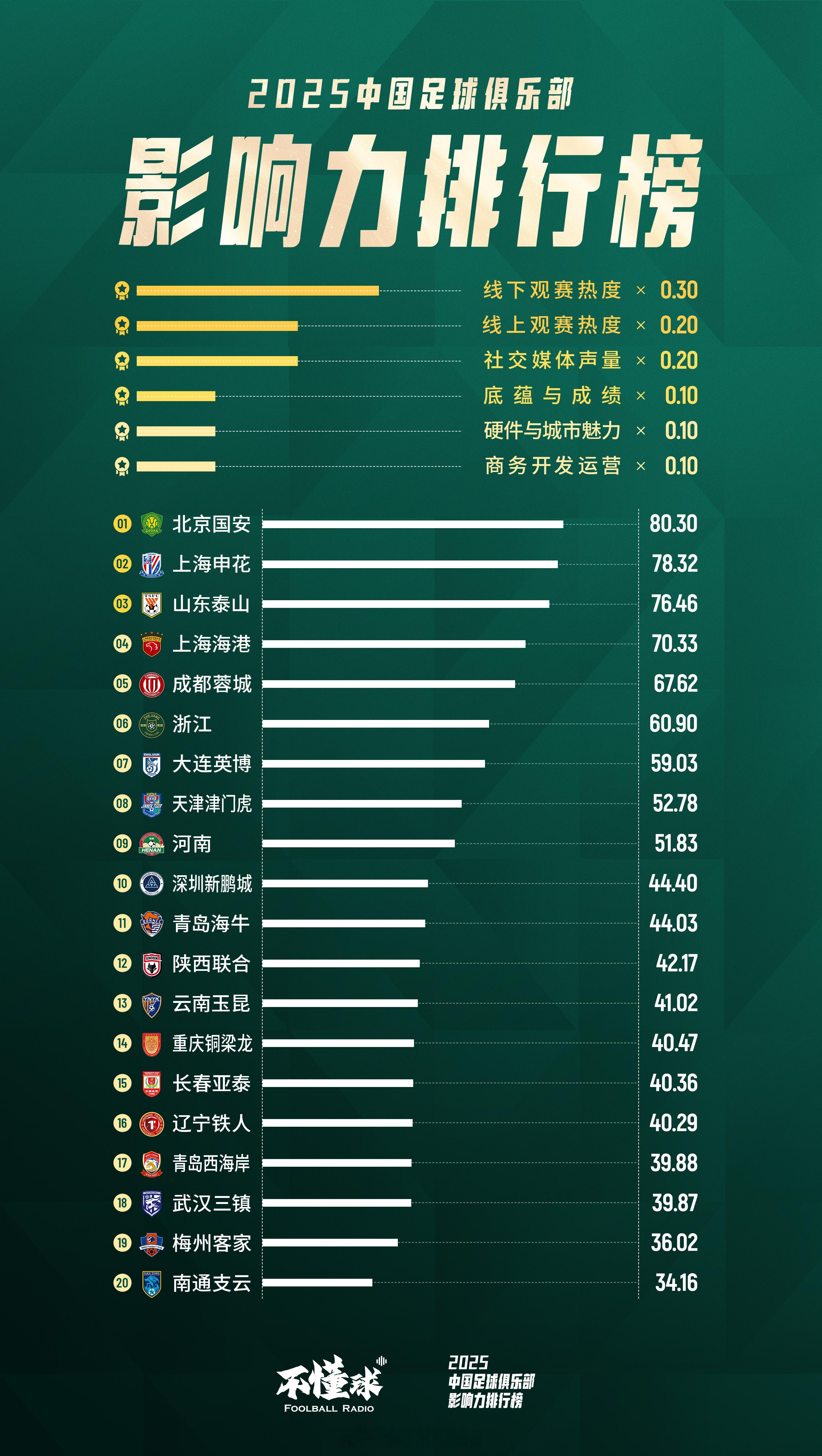 不懂球发布了「2025年中国足球俱乐部影响力排行榜」根据线下观赛、线上观赛、社交媒体声量、底蕴与成绩、硬件与城市魅力、商务开发运营六大维度、59项核心指标计算得出:北京国安获得2025年最具影响力俱乐部上海申花位列第二,山东泰山位列第三上海海港、成都蓉城 、浙江和大连英博分别位列四、五、六、七名。天津津门虎、河南位列第八和第九陕西联合、重庆铜梁龙和辽宁铁人,凭借高上座率和其他多项指标,力压中超俱乐部进入榜单前十六名。