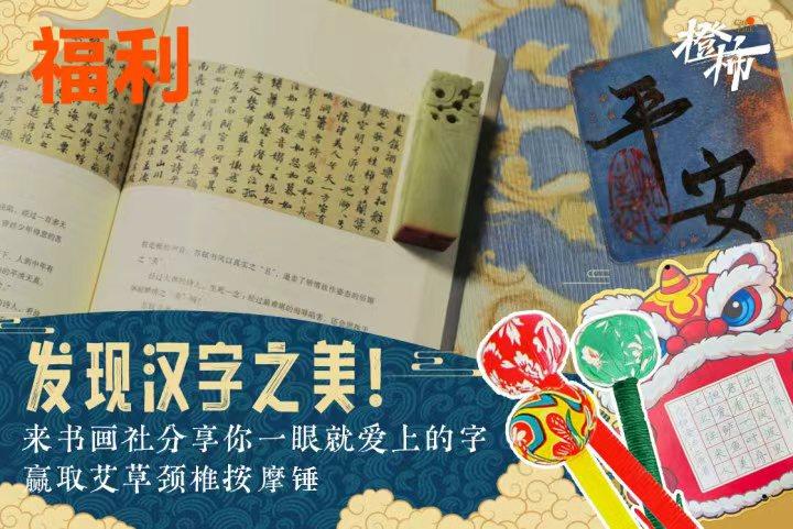 活动方式:来橙友圈#橙柿书画社#话题,带标签#汉字之美#发帖,晒晒你一眼看到就喜欢的字,可以是街头好看的招牌,路边小店的设计感字体,老街小巷里风格独特的字型,小物件上的可爱商标等,让你印象深刻的字都可以来分享。发帖打卡满10次,人人有奖。