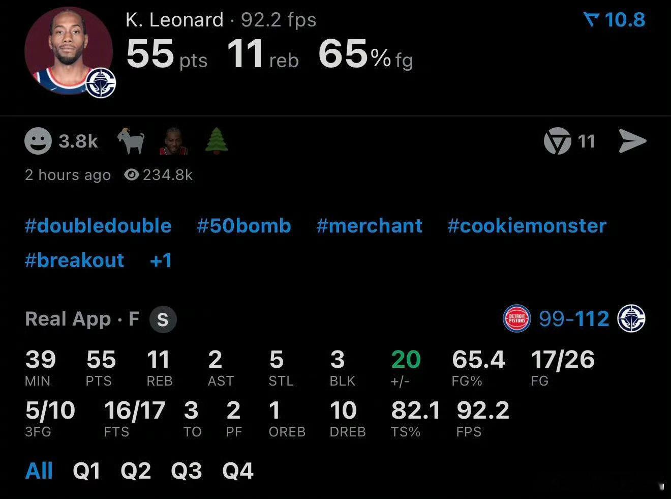 彻底北伐!坎宁安杜伦遇到终结者!小卡50+一战创多项纪录!北京时间12月29日,快船以112-99大胜活塞!快船已经开始北伐!连斩联盟强敌!豪取四连胜!这场比赛必须好好夸夸小卡伦纳德!太牛逼了,当代乔丹啊!比赛开始不久,伦纳德就用一记中投为快船首开纪录。虽然这一节哈登是主攻点,但伦纳德在防守端贡献显著,单节就送出了2次抢断和1次盖帽,帮助球队在首节以33-20建立起两位数的领先优势。第二节,他单节独揽15分,更恐怖的是在防守端再添2次抢断和1次盖帽。半场结束时,他已经高效砍下25分,并贡献了惊人的4次抢断和2次盖帽,快船也以60-42领先18分。第三节这一节彻底成为了伦纳德的个人表演。活塞试图反扑,但伦纳德用无解的单打予以回应,单节12投9中,狂轰26分。他在本节通过罚球创造了个人职业生涯单场得分新纪录(此前为45分),三节战罢个人得分已达到51分,比赛也几乎失去悬念。第四节由于比赛早早进入垃圾时间,伦纳德在末节出场时间不多。他最终将自己的得分定格在55分,并摘得11个篮板,全场还送出了5次抢断和3次盖帽,填满了数据栏!伦纳德封神之夜!本场比赛伦纳德出战约39分钟,26投17中,三分球10中5,罚球17中16,交出了一份历史级的数据单:一战创下多项纪录其一队史纪录:55分追平了由哈登保持的快船队史单场最高得分纪录。历史唯一数据:他成为NBA历史上首位单场至少得到 55分10篮板5抢断和3盖帽的球员。赛季快船第二位50+:这是本赛季快船出现的第2次个人单场50+得分。伦纳德也因此成为快船内第二位达成此成就的球员(第一位是哈登)。本赛季联盟第9位50+球员:约基奇(2次)、哈登、亚历山大、马克西、穆雷、马尔卡宁、里夫斯、戈登。快船为何能赢?首先伦纳德无可挑剔的发挥是赢球基石。此外,哈登尽管手感一般,但仍贡献了28分和7次助攻,在组织和关键得分上提供了支持。但是最关键的人物就是小琼斯!琼斯因伤缺席了16场比赛,在这16场中,快船只赢了5场比赛!而琼斯的复出毫无疑问在攻防两端都彻底解放了小卡!这也是小卡今天为什么能爆发的原因!虽然小卡今天在防守方面也非常出色,但是小琼斯复出就是小卡在防守端的一颗定心丸!活塞为何会输?背靠背是一个原因,核心等都在今天明显体力不支,但是最关键的是,他们遇到了本赛季最强一战的小卡!即使活塞全员体力充沛,估计也打不过这机器般效率的乔丹!总之,随着快船伤员逐渐康复,目前已经取得四连胜,北伐已经开始了!小卡伦纳德NBA新赛季NBA热点快船莱昂纳德哈登哈登洛杉矶快船伦纳德