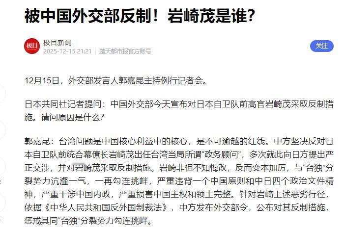没想到,被中国制裁的日本政客岩崎茂,居然被爆出在中国有着巨额的资产,他的儿子在中方也有着很大的生意,这下日本彻底被打倒七寸上了。 岩崎茂曾经是日本自卫队的“总参谋长”,也就是统合幕僚长,2012年到2014年在任期间,手里攥着日本三军的作战指挥权。 在职的时候就一门心思搞对华强硬那一套,公然宣称要强化钓鱼岛周边的军事姿态,还拼命推动在西南诸岛搞军事部署。 卸任之后他也没闲着,继续当日本防卫大臣的政策顾问,2025年3月更是不顾中方警告,直接跑去当台湾地区所谓的“政务顾问”,还参与了台湾民间智库搞的“台海防卫兵推”。 最讽刺的是,这个嘴上把中国骂得一文不值的人,暗地里却在中国赚得盆满钵满。 他名下不仅有在大连的冷冻仓储公司股份,还长期担任全日空航空控股这类在华有深厚业务布局企业的顾问,靠军政人脉捞取好处。 更让人不齿的是,他一边靠着中国市场赚钱,一边拿着这些钱在日本渲染“中国威胁论”,推动各种反华政策,试图在政治上捞取资本。 这种两头通吃的算盘,打得倒是挺精,可他忘了,中国从来都不会惯着这种两面派。 2025年12月15日,咱们外交部直接依据《反外国制裁法》,对岩崎茂发布了外交部令,甩出了反制“三板斧”: 冻结他在国内所有的动产不动产,不准国内任何企业个人跟他做交易,而且永远不给他人境签证,连港澳都进不来,这一下直接戳中了岩崎茂的软肋。 他儿子的生意也受了波及,原本靠着对华合作赚得不少,制裁一出,国内合作方连夜终止合作,订单全没了,生产线直接停摆,多年搭起来的商业网络一夜之间就崩了。 可能有人觉得,制裁一个退休高官而已,怎么就说打在了日本的“七寸”上?这就不得不说日本政商界的一个通病了,很多人都抱着侥幸心理,觉得能“政治上反华、经济上依赖中国”。 尤其是不少日本退役高官,靠着过去的人脉搞“旋转门”,一边在国际上搞反华活动,一边在中国做生意赚钱。 岩崎茂就是这种模式的典型代表,而咱们这次制裁,直接把这个“旋转门”给焊死了。 制裁一出,日本政商界的反应就能说明一切。原本有十几个日本退役将官还计划跟着岩崎茂去台湾捞名声,看到他的下场后,一半的人直接找借口不去了,剩下的也吓得躲去了夏威夷。 日本经产省的数据也显示,2025年12月日本对华订单环比直接下跌了3.2%,很多企业都开始主动排查,生怕自己跟哪个反华政客扯上关系。 要知道,中国是日本最大的贸易伙伴,日本的半导体、汽车这些核心产业,还有90%以上依赖进口的稀土,都离不开中国市场。 要是因为反华丢了这个大市场,日本经济根本扛不住。 这就是中国的态度:从不主动惹事,但也绝不怕事。任何敢挑战中国底线、损害中国利益的人,不管藏得多深、背后有谁,咱们都能精准找到他的软肋,让他付出应有的代价。 想在政治上挑衅中国,就别想在经济上占便宜;想靠中国市场赚钱,就必须尊重中国的主权和领土完整,这个底线谁也不能碰。