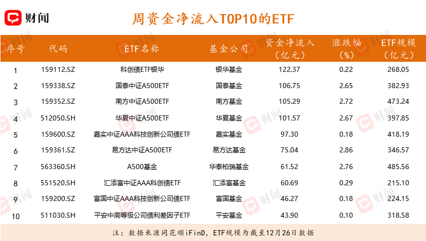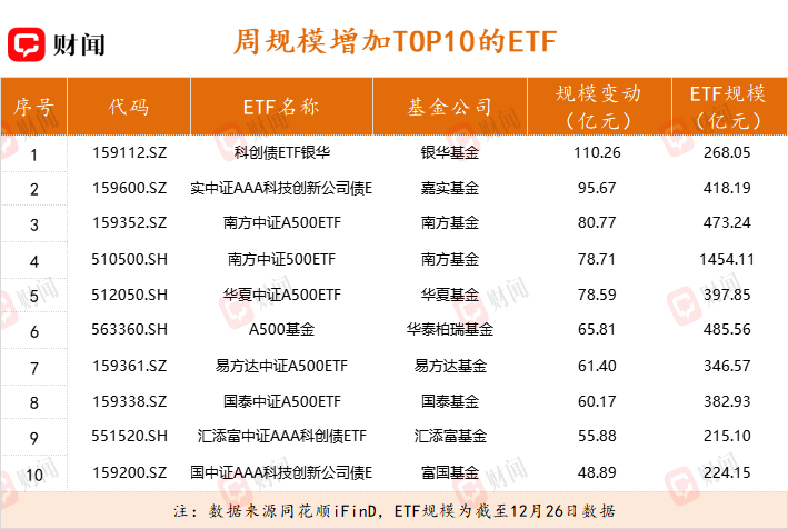 资金流向呈现出明显的板块分化特征。规模增长方面,以科创债和中证A500为代表的相关ETF获得了大量资金青睐。其中,科创债ETF银华(159112.SZ)以超过110亿元的净流入居首,同时南方、华夏、华泰柏瑞等多家头部基金公司旗下的中证A500ETF亦集体获得显著资金申购,显示出市场对科技创新主题与宽基指数配置需求的同步升温。