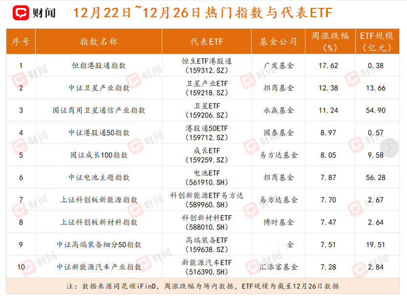 商业航天相关概念迎来大涨,卫星产业ETF(159218.SZ)周内涨幅超过10%,恒生ETF港股通(159312.SZ)净值增长同样值得关注,单周涨幅超过17%。