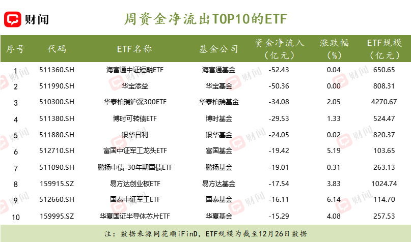 流出端海富通中证短融ETF(511360.SH)连续两周净流出排名全市场第一,此前周净流出27.95亿元后,上周净流出超50亿元,两周净流出约80亿元。此外,部分军工主题类ETF和货币型ETF同样被资本抛售。