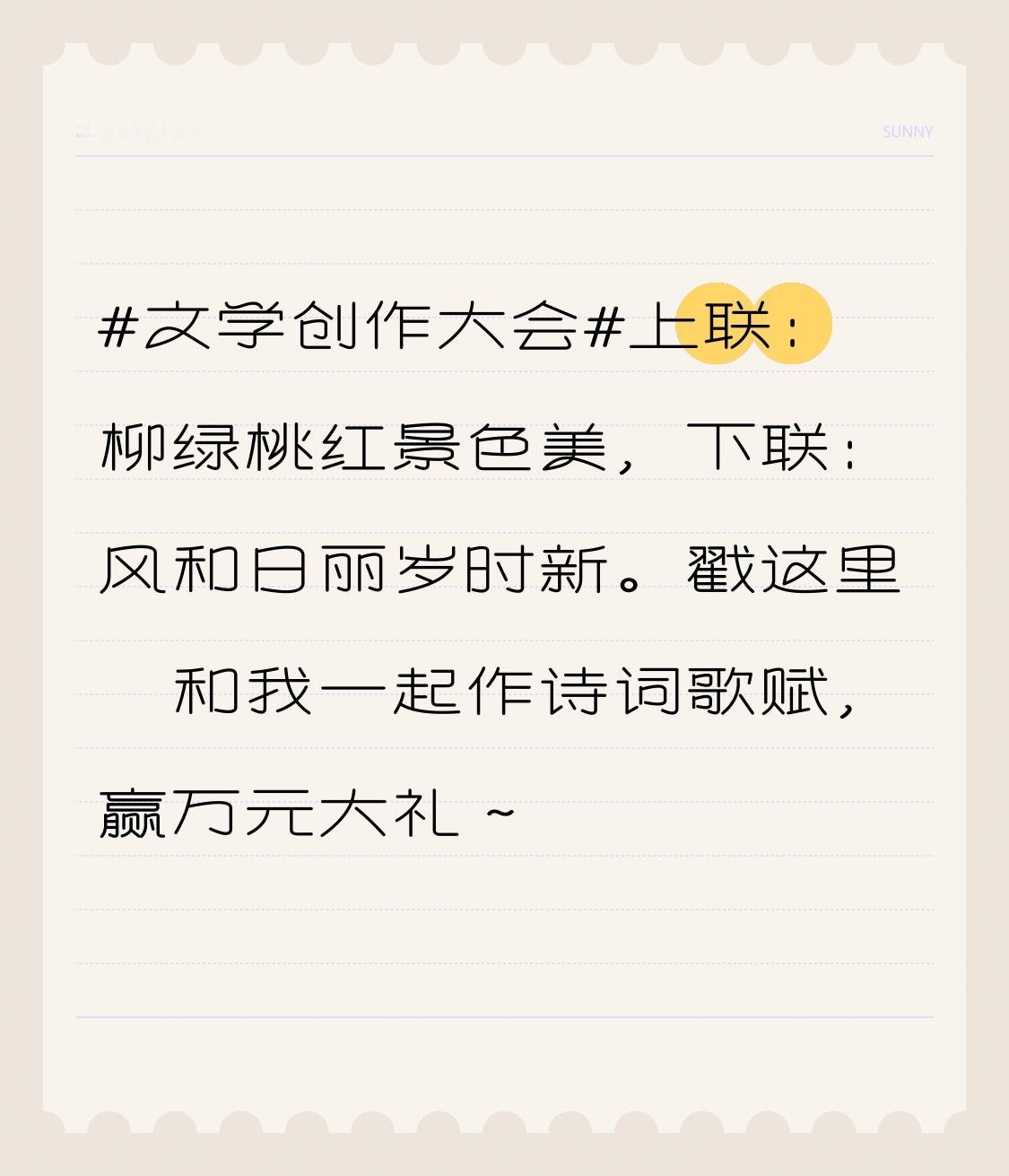 文学创作大会 这上联“柳绿桃红景色美”,描绘出一幅色彩斑斓的春日美景,柳丝翠绿,桃花嫣红,光是想想就觉得美不胜收。下联“风和日丽岁时新”也相当妙,风和日丽的好天气,寓意着新的一年万象更新。 参加文学创作大会来对对联、作诗词歌赋,简直太有意思啦!既能展现自己的文学才华,又有机会赢万元大礼。我已经跃跃欲试,准备大展身手。说不定在这过程中,还能结识一群志同道合的文学爱好者,一起交流创作心得,想想就很美好。大家也赶紧来试试吧!