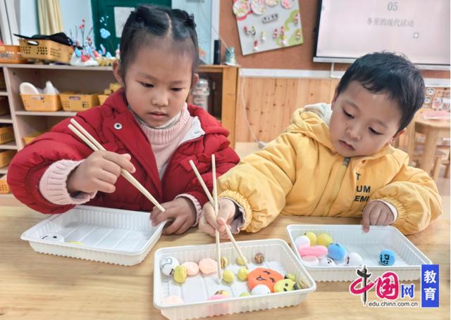 游戏中欢呼声不断,宝贝们手持小筷子,屏息凝神,小心翼翼地将“汤圆”从一个托盘夹到另一个托盘。孩子们在趣味游戏中锻炼了手部精细动作和手眼协调能力,也收获了暖意与快乐。