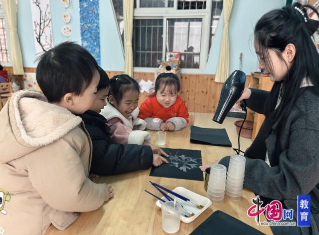 当教师手持盐水和画笔在黑色的卡纸上画出雪花模样后,吹风机轻轻吹拂纸面时,神奇的一幕发生了。“哇!雪花,真的出来啦”“好漂亮呀!”孩子们迫不及待投入到了实验中,一阵阵欢呼声此起彼伏。孩子们感受着科学的奇妙,也把小寒时节对雪花的期盼,藏进了这神奇的实验里。