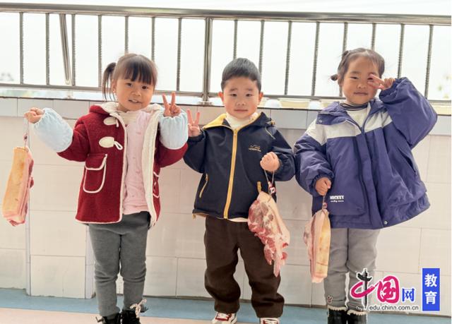 为了让孩子们更直观地感受小寒民俗,幼儿园开展了家长进课堂“腌腊肉”活动,家长及老师提前准备好新鲜的肉、香料和工具,一边示范腌腊肉的步骤,一边讲解。孩子们好奇地围在旁边,时不时举手提问:“这个调料是甜的吗?”“腊肉要放多久才能吃呀?”宝贝们近距离感受了小寒民俗美食的制作魅力,也加深了对小寒节气的理解。
