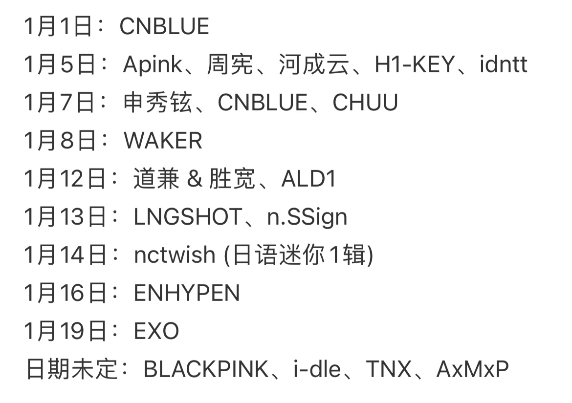 令人期待的一月回归阵容🎊1月1日:CNBLUE1月5日:Apink、周宪、河成云、H1-KEY、idntt1月7日:申秀铉、CNBLUE、CHUU1月8日:WAKER1月12日:李硕珉 & 夫胜宽、ALD11月13日:LNGSHOT、n.SSign1月14日:nctwish (日语迷你1辑)1月16日:ENHYPEN1月19日:EXO日期未定:BLACKPINK、i-dle、TNX、AxMxP