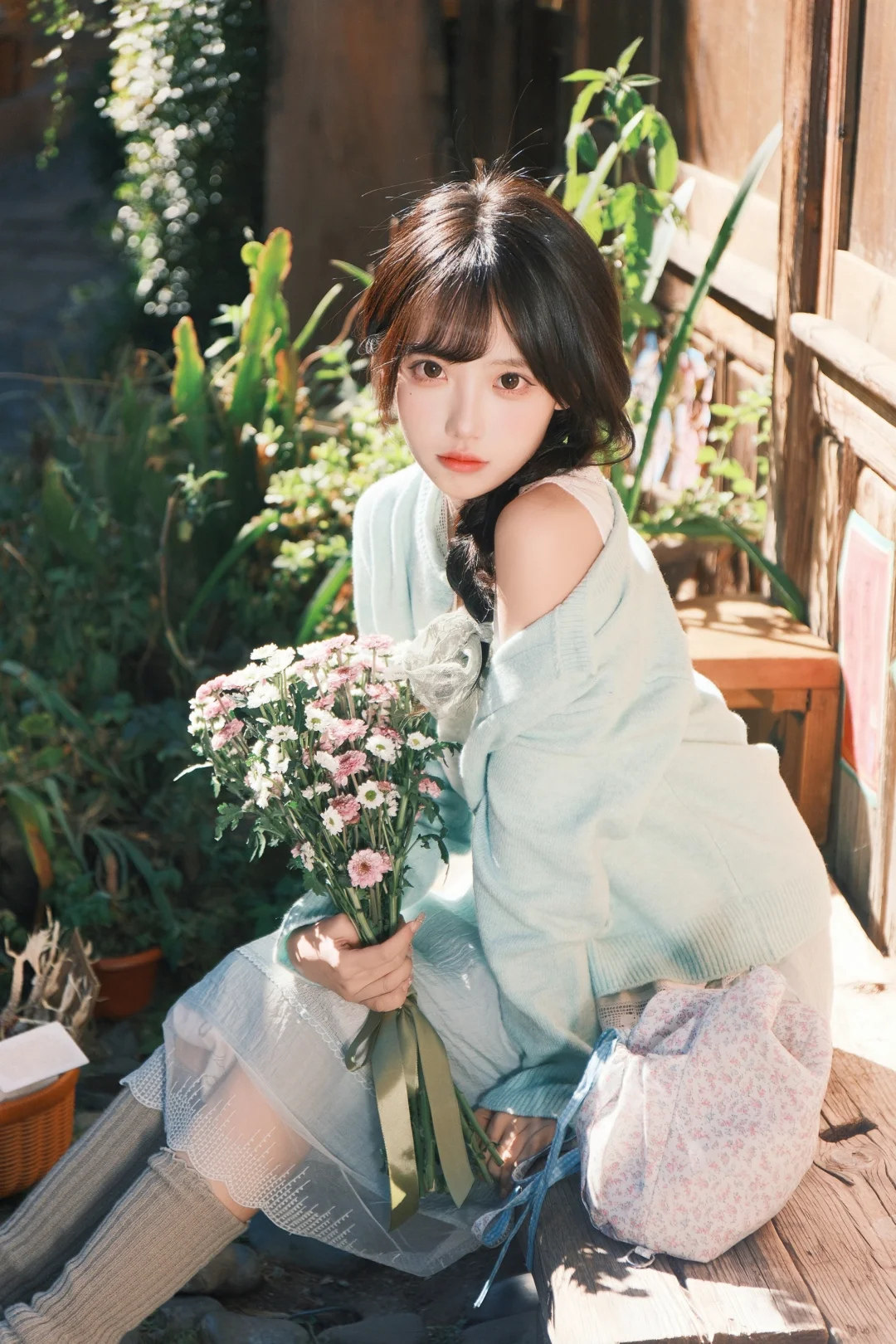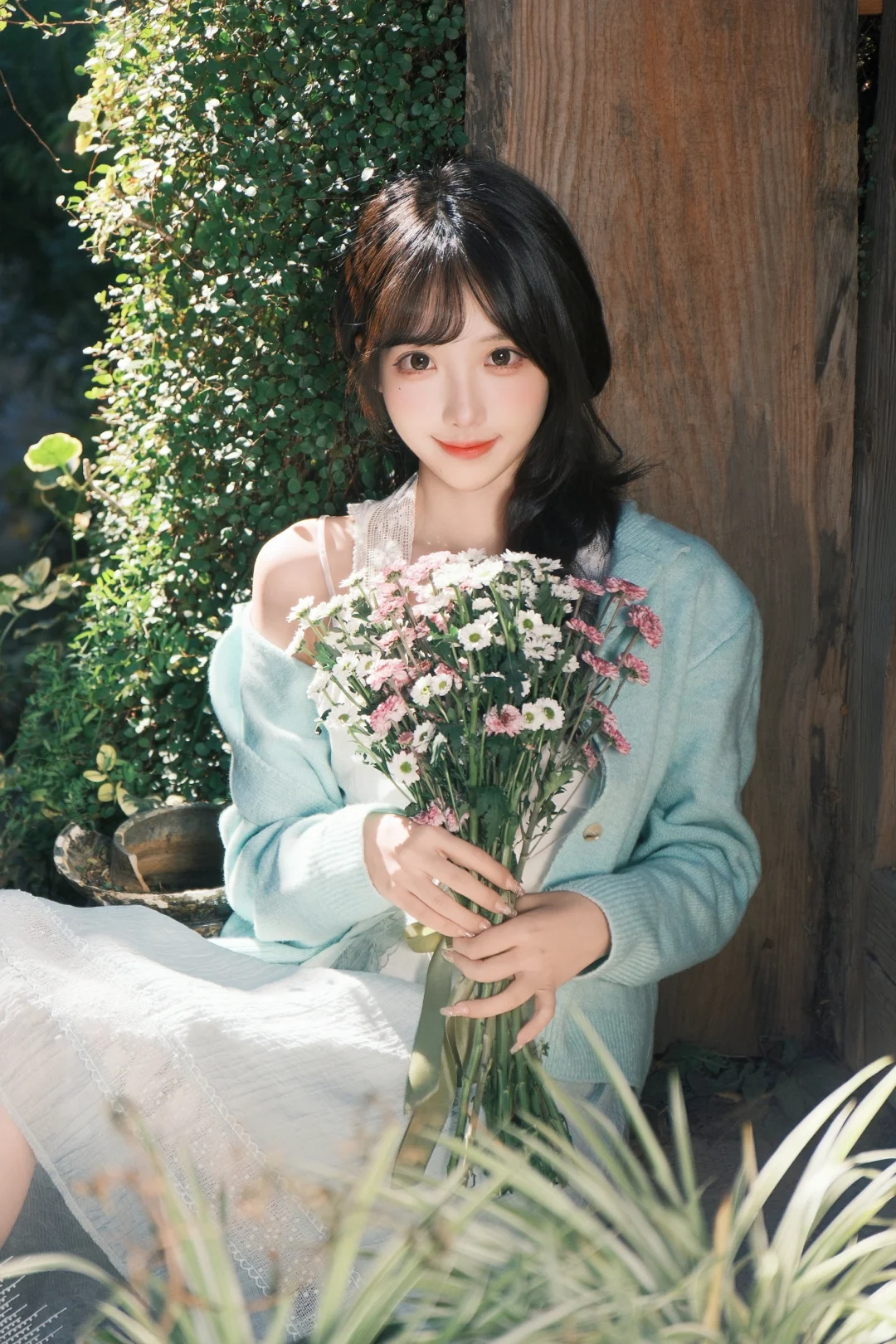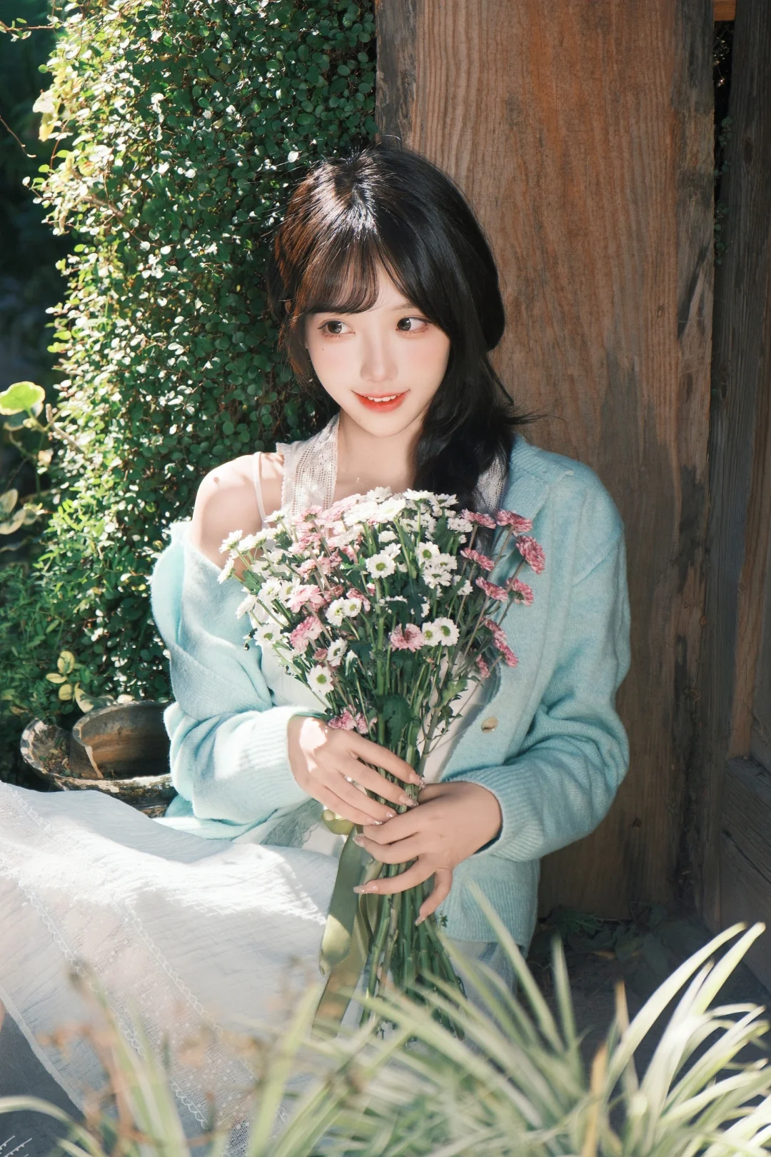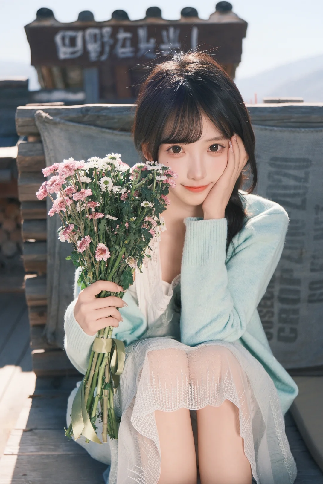 在古镇的石桥上,优雅地坐着,享受宁静的时光。