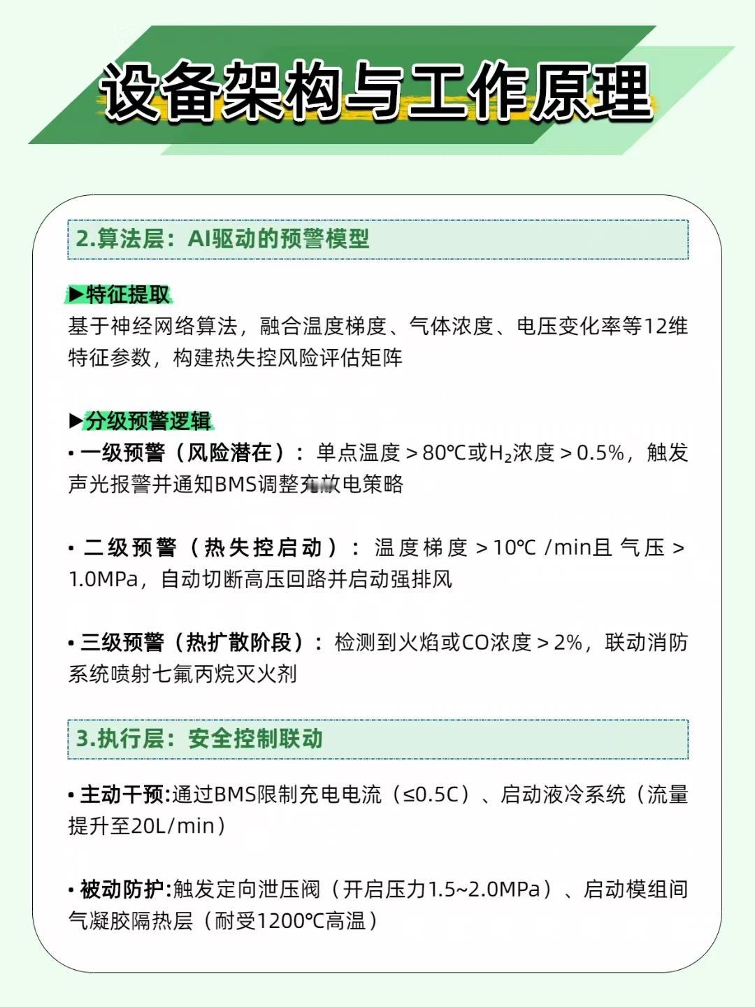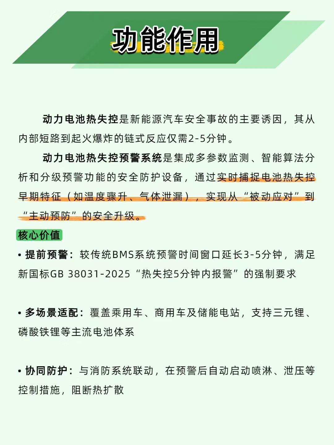 新能源车电池起火只要 2 分钟?这系统是电池的 “提前预警消防员”! 新能源车最吓人的就是电池热失控 —— 从内部短路到起火爆炸,最快只需要 2-5 分钟!而动力电池热失控预警系统就是给电池装了个 “预言家 + 消防员”,把危险掐在萌芽里! 1、它是这么护着电池的: 🕵️ 全维度盯梢:温度、气体(H₂/CO)、气压全监测,电池 “刚发烧”“刚漏气体” 就被抓包 🧠 AI 分级预警: 一级预警(风险潜伏):电池超 80℃就声光提醒,调充电策略降温 二级预警(失控启动):温度狂升 + 气压飙高,直接切高压回路 + 强排风 三级预警(扩散阶段):检测到火焰 / 高浓度 CO,立刻联动喷灭火剂 ⏰ 多赚逃生时间:比传统系统多预警 3-5 分钟,够你安全停车撤离 2、这系统早就是 “安全标配” 了: 宇通客车装了它,2024 年预警 32 次电池故障,没一起起火;宁德时代储能站用它,把热失控扩散时间从 30 秒拉到 15 分钟!