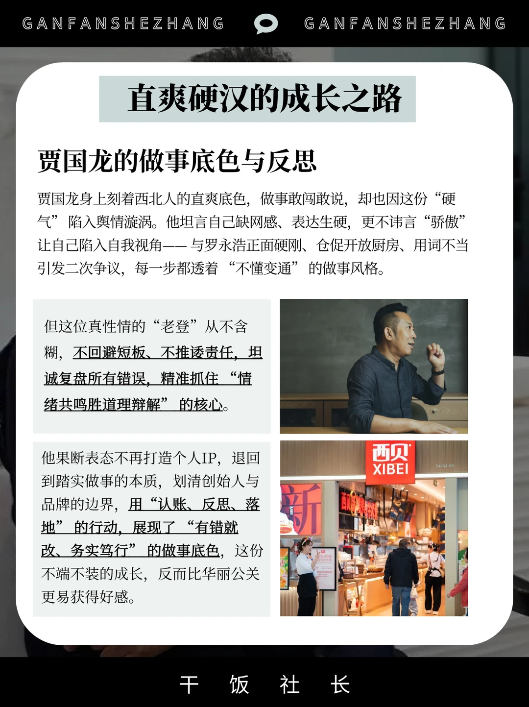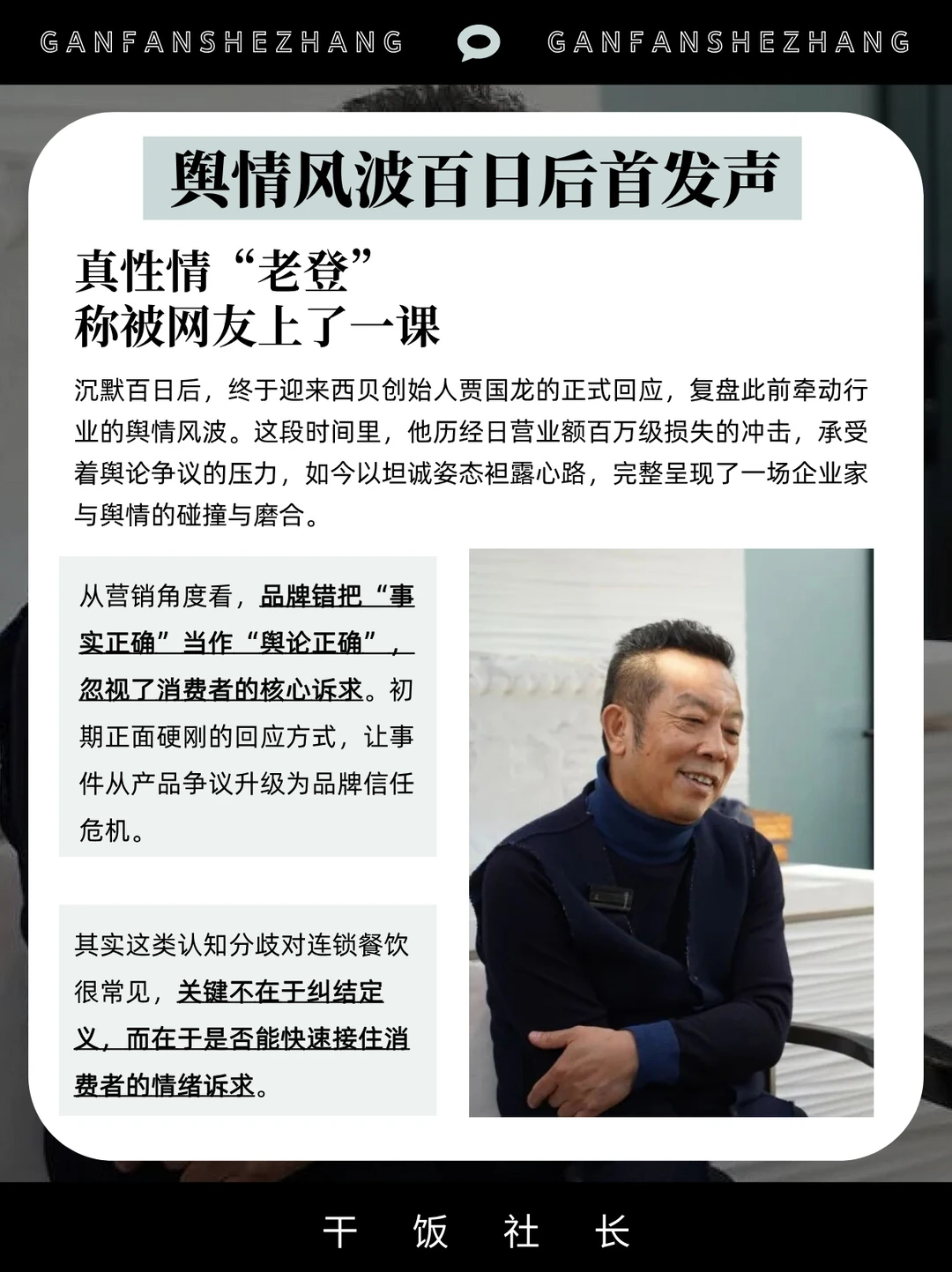 贾国龙在访谈中亦反思了企业领导者在危机中应避免情绪“硬刚”,应将重点转向倾听与务实改进。其舆情应对策略也从“辩解型”转向“解决型”,既体现了创始人对市场反馈的深度响应,也展现了企业面对舆情时的务实态度,这种“听劝+落地”的组合,也让我们看到品牌化解争议、重塑市场信任的有效策略。