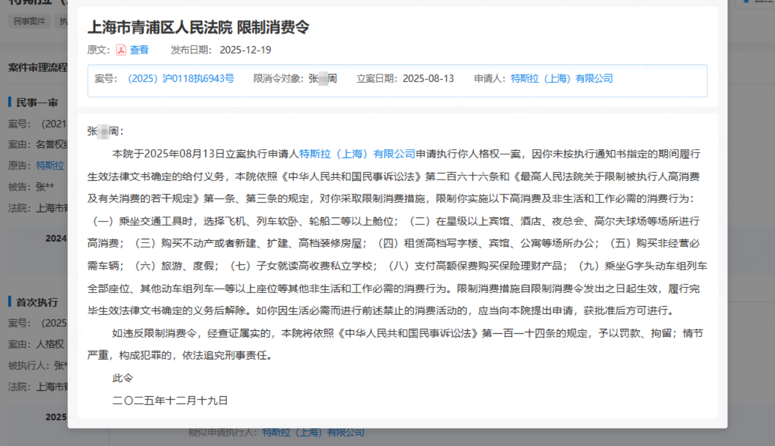 特斯拉申请限消车顶维权女车主 还记得之前车展特斯拉维权事件吗?最近双方的名誉权纠纷案件又更新了,站车顶喊“刹车失灵”的维权女车主被限制高消费,申请人为特斯拉。赢特斯拉的官司是要回数据,但是说刹车失灵这事败诉,今年8月被执行了17.23万元,只能说冲动是魔鬼啊......小伙伴们怎么看这个案件,站哪一边儿?评论区讨论讨论。