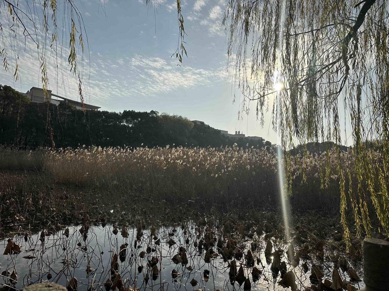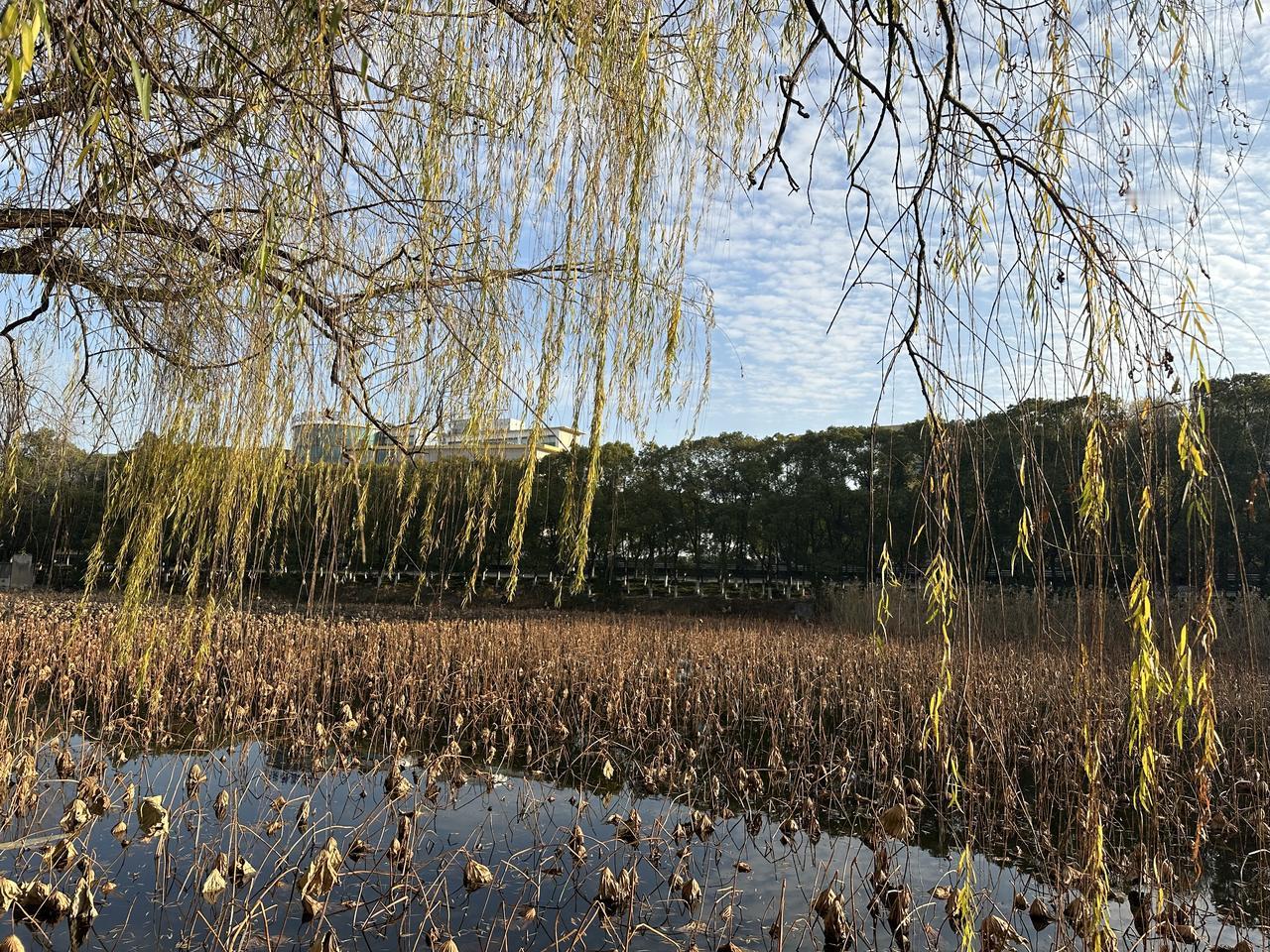 公园遛弯儿拍美景湖边的垂柳随风飘动,景色真美。