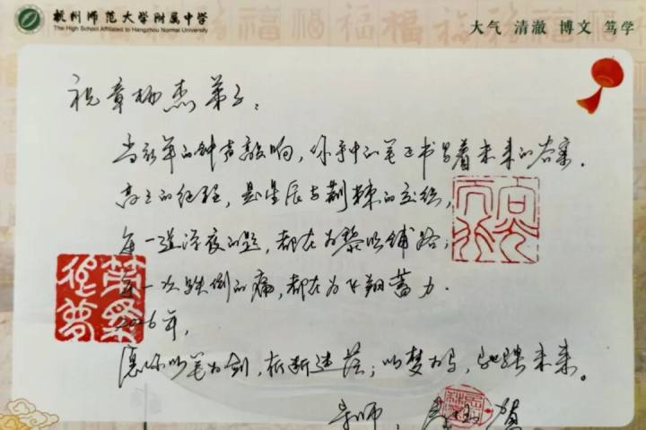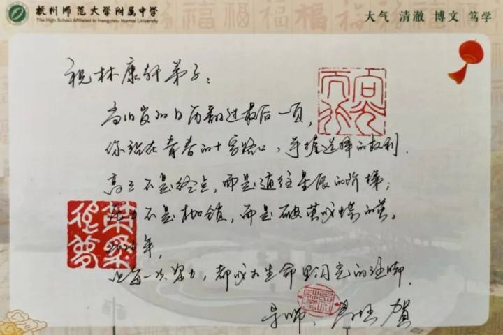 马上就是元旦和首考,杭州师范大学附属中学副校长寿柱,今天给他的12位弟子,手写了12张贺卡,送上元旦和首考的祝福。