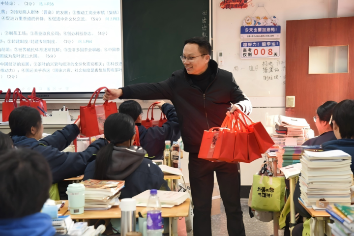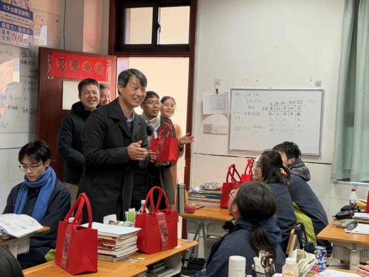 今天,杭州第七中学在周一晨会上,播放了高三祝福视频,紧接着,校领导们走进高三教室,给高三师生送上福袋,祝福学生:首考即胜,马到成功!