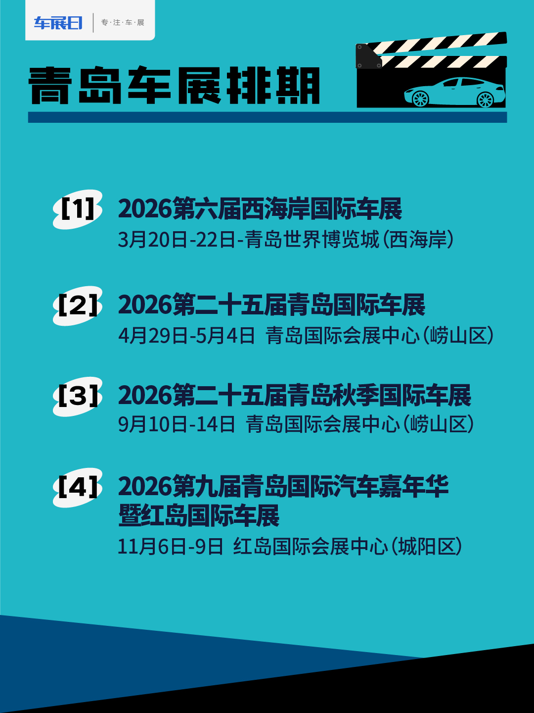 2026年青岛将举办多场车展,目前已定档的有四场。西海岸国际车展将于3月20至22日在青岛世界博览城举办;青岛国际车展将于4月29日至5月4日在青岛国际会展中心举办;青岛秋季国际车展9月10日至14日在青岛国际会展中心举办;红岛国际车展在11月6日至9日在红岛国际会展中心举办。