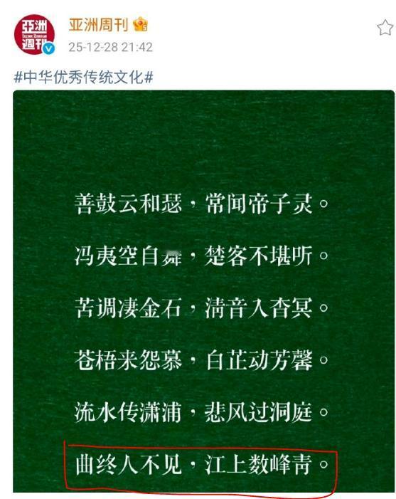虽然《亚洲周刊》删除清空了南博和徐莺的相关报道,但是学到了两个词句。 [谢谢] 1)"求挂得挂"。 这是网络流行语,“嘴上说想挂,结果真挂了”,就是“许愿成功”的黑色幽默说法。 [捂脸] 2)”曲终人不见,江上数峰青。“ 这是唐代钱起《省试湘灵鼓瑟》的最后两句,乐曲终止,鼓瑟之人已无处寻觅,只有湘江之上几座青峰静静伫立。集合《亚洲周刊》前面的一些帖子,感觉瑟瑟发抖。