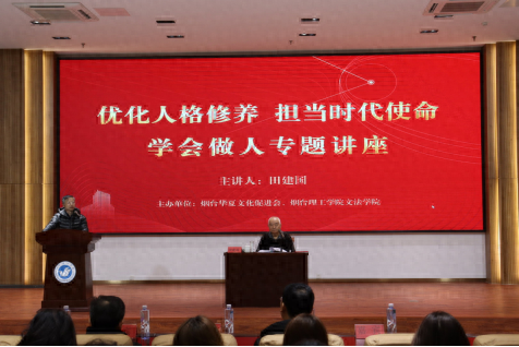 为深入贯彻立德树人根本任务,传承中华优秀传统美德,12月12日,烟台华夏文化促进会携手烟台理工学院文法学院成功举办“修高尚人格·做时代新人”专题讲座。作为“中华美德大讲堂”系列公益宣讲的重要组成部分,旨在以中华美德为滋养,为青年学子搭建人格修养提升平台。烟台理工学院副校长、文法学院院长苏春景主持讲座,资深教育专家田建国教授亲临授课,为文法学院300余名师生带来了一场兼具思想深度与实践价值的精神盛宴。