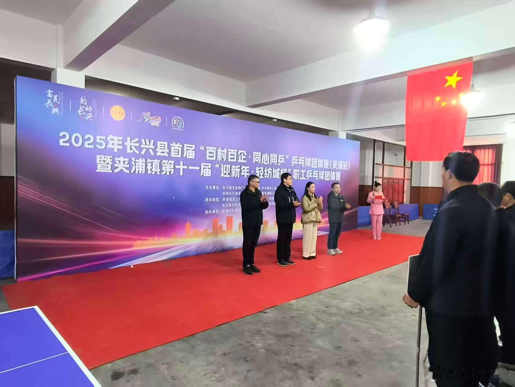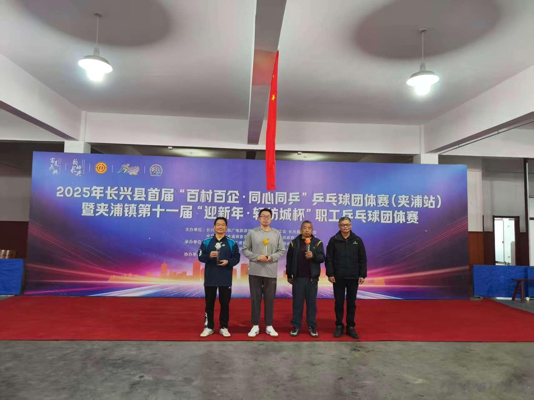 日前,浙江湖州长兴县首届百村百企.同心同乒乒乓球团体赛(夹浦站)暨夹浦镇第十一届“迎新春.轻纺城杯”职工乒乓球团体赛落下帷幕,本次比赛共有10支球队参赛,经过一天的激烈比拼,夹浦村代表队夺冠、鑫涛科技和环沉村代表队获亚军和季军。