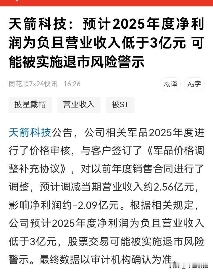 【突发,或被ST!】风口表现时,突发利空会如何? 天箭科技最新公告表明,公司预计2025年度净利润为负,且营业收入低于3亿元,股票交易或被实施退市风险警示。 瞧瞧这业绩表现,利润下滑得极快,宛如坐滑滑梯一般,如今已然亏损!若被ST,参与热门股炒作的投资者将陷入何种境地?谨慎些吧,对于业绩欠佳、未达标的公司,尽早避开为妙! 如何正确看待股市