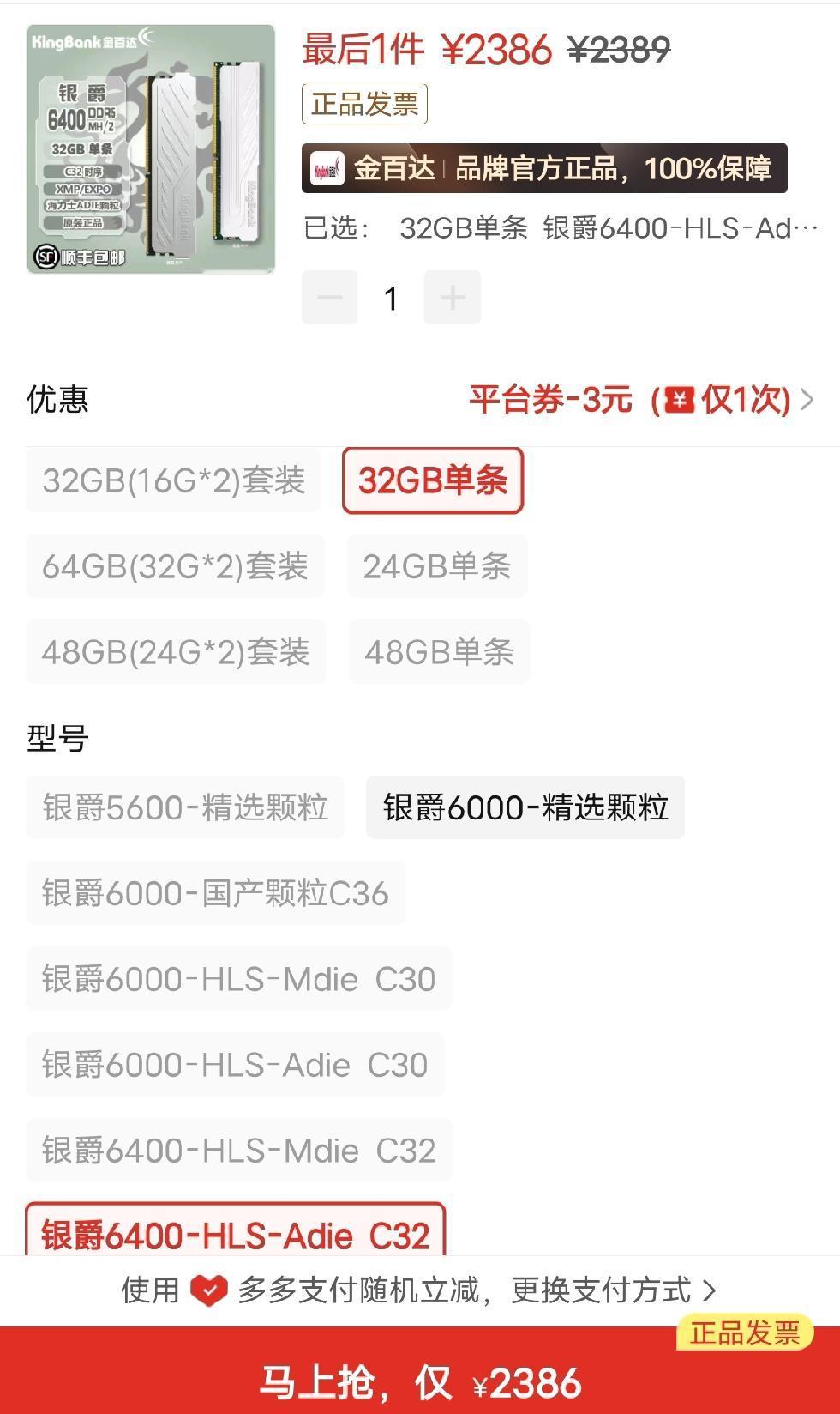 去年1285元能买一对32G的。今年单条32G就要2389元,懵了,差距竟如此之大?都有点想把它拆了卖掉。 忽然间,有种似曾相识之感。去年装电脑时,也有涨价的情况,当时是显卡。有的人的显卡用了一两年,居然还能按购买时的原价卖出,也就是说,去年疯涨的是显卡。 评论:电脑配件本是年年迭代、价格走低的。但会定期出现突然涨价的情况。这就让低位购买的人,在高位时能原价出手,相当于白用了一两年。有心人会发现,电脑配件的价格走势并非一路向下或向上,而是上上下下,呈现出股市的态势。说没人为干预,实在难以让人信服。 实际上,很多商品随着生产率的提高,成本大幅降低,尤其是在工业时代。虽说电脑配件属于高科技、高精密产品,但毕竟已发展了几十年,近二十年的技术迭代感觉都被控制着,就是为保证每年只进步一点点。最典型的就是CPU,从126开始“挤牙膏”的幅度稍大了些,所以126成了一代“神U”。 理性看待涨价事件吧。涨得太离谱时,尽量选择低配,尤其是内存,一个内存价格几天内就大幅上涨,实在太不可思议了。