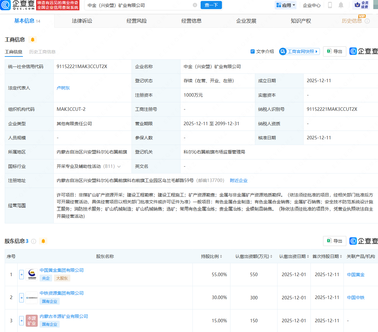 企查查APP显示,近日,中金(兴安盟)矿业有限公司成立,法定代表人为卢树东,注册资本为1000万元,经营范围包含:非煤矿山矿产资源开采;建设工程勘察;建设工程施工;矿产资源勘查;有色金属合金制造等。企查查股权穿透显示,该公司由中国黄金集团有限公司、中铁资源集团有限公司等共同持股。