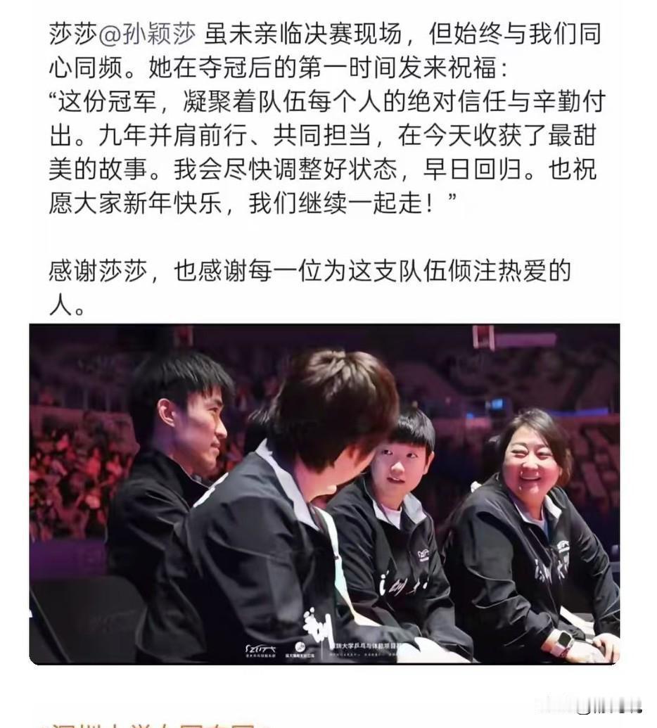 真正的冠军,是在自己上不了场时,依然能让队伍夺冠的那个人。 你看到她坐在替补席上,没碰球拍,却比场上任何人都咬紧牙关。 深大夺冠那晚,聚光灯没打向她,但她的心跳随着每一个球起伏。 她说:“奖牌是队友帮我赢回来的。 ” 这句话背后,是九年来彼此一个眼神就懂的默契。 身体被迫停下时,她用信任托住了整个团队。 教练组现在盯着她的恢复数据,点头的频率越来越高。 训练馆的灯每天为她多亮两小时,那不是苦熬,是蓄力。 下一次国际赛的名单上,一定有她的名字。 胜利从不只属于扣杀的那个人,更属于那个相信队友、守住后方的人。