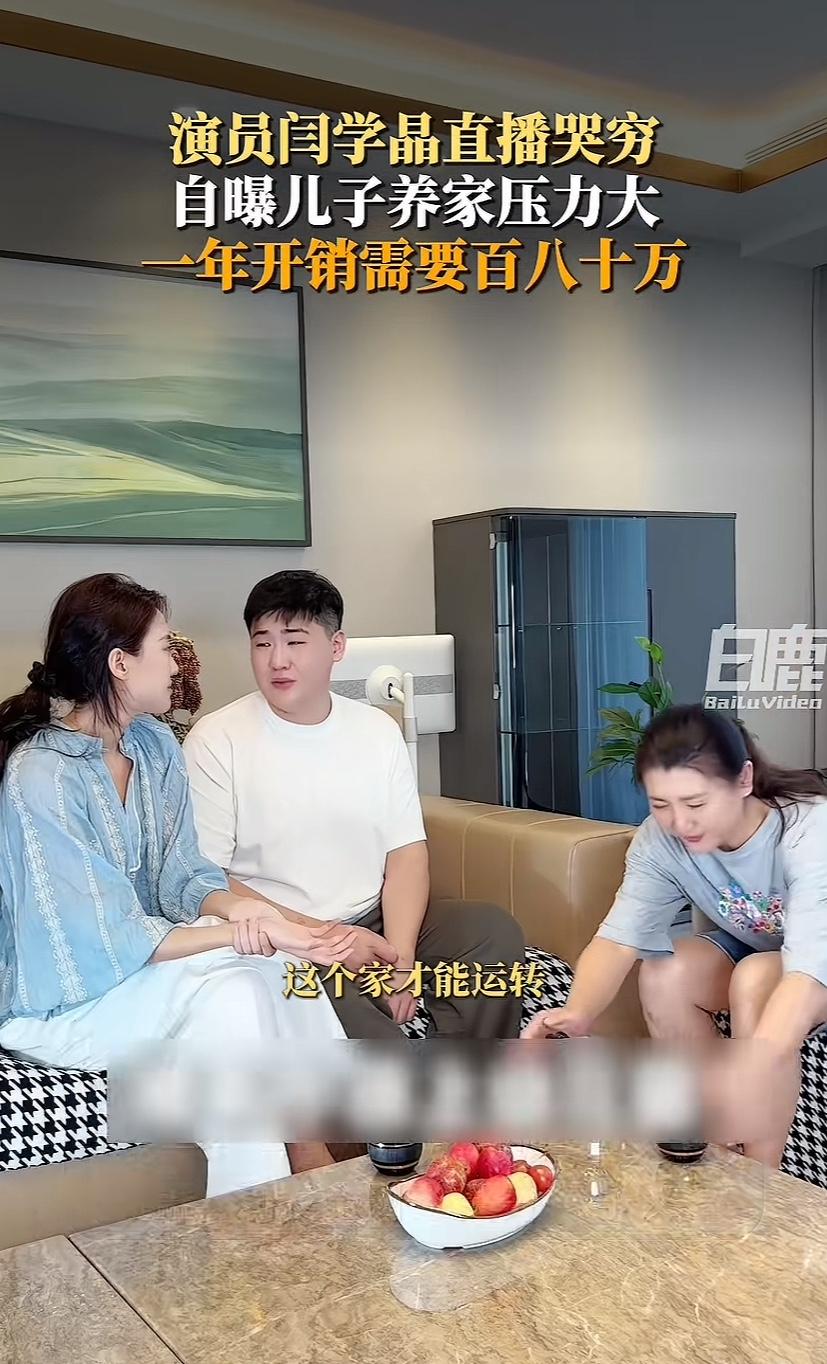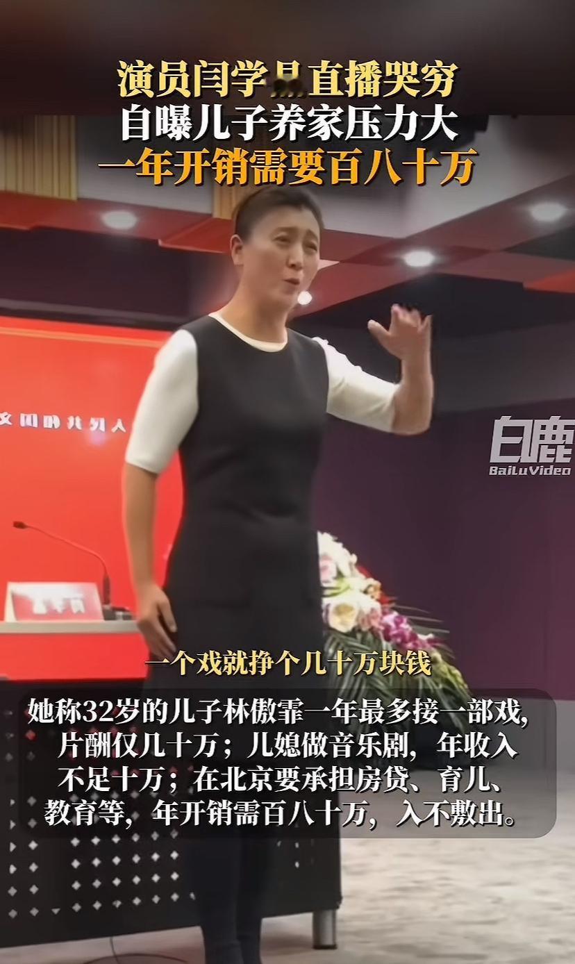 【著名演员闫学晶直播间哭穷,收入几十万无法养家,对此你怎么看?】 近日,著名影视演员、春晚常客、著名表演艺术家、影视前辈闫学晶在直播间哭穷,直言自己的儿子一年赚几十万,自己的儿媳一年赚不到十万,还得在北京承担房贷、育儿、教育等,收入几十万,家庭开支需要百八十万!由此,引发网友的关注!你是怎么看的呢? 在我看来,闫学晶也是老演员了,也是出演多部电视剧,甚至以草根或者农村题材而出名,按照以前的收入,闫学晶的收入肯定不会低!现在自己的儿子收入几十万,加上自己本身的原始资金积累,她们家庭可支配的资金不会低!另外就是,房贷也是基于自己的收入水平,一个著名演员还有房贷,想来也是可笑啊!现在直播间直接哭穷,想来也是搞笑啊!闫学晶这些年也是几乎淡出大众视野了,现在通过塑造这样的话题而引发关注,想来也是博流量的一种手段,当然这个也是一种新的出圈方式,也是一次重新走红的机会!只是,这样的哭穷方式,也是让人有些想笑的! 都知道这些年以来,因为口罩问题,很多人的收入几乎都是断崖式,有些甚至是朝不保夕,但是能够一年又几十万收入的家庭,竟然在直播间哭穷,那么其他人怎么办?闫学晶此举确实有些让人意外,我觉得就是为了流量而博出圈,这样的方式不可取!