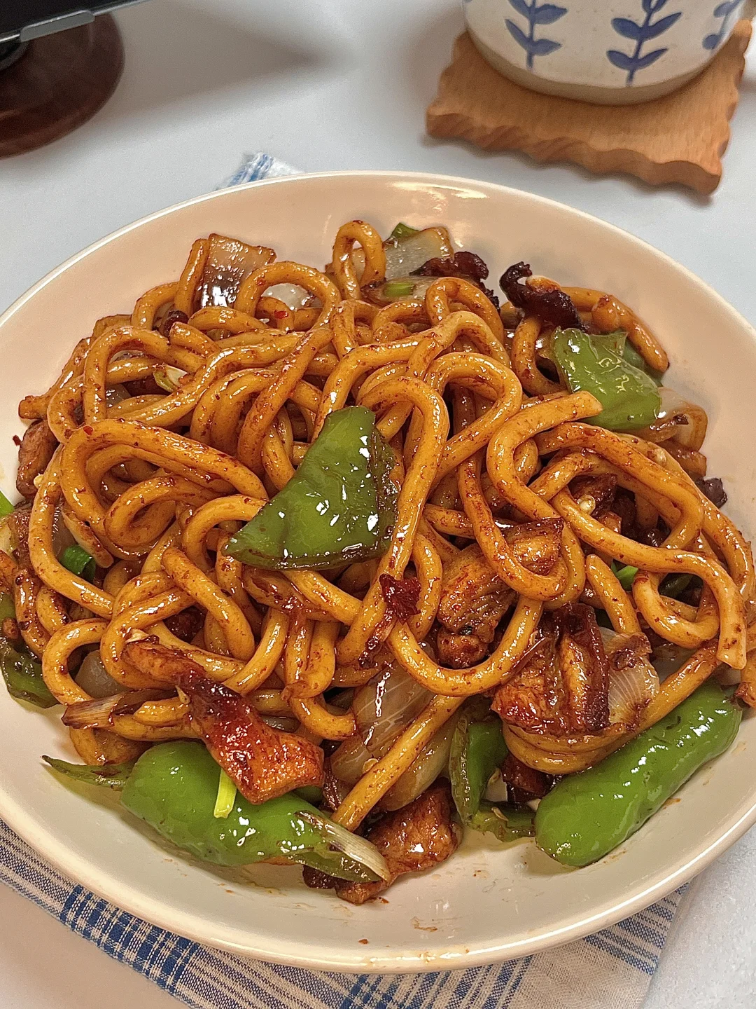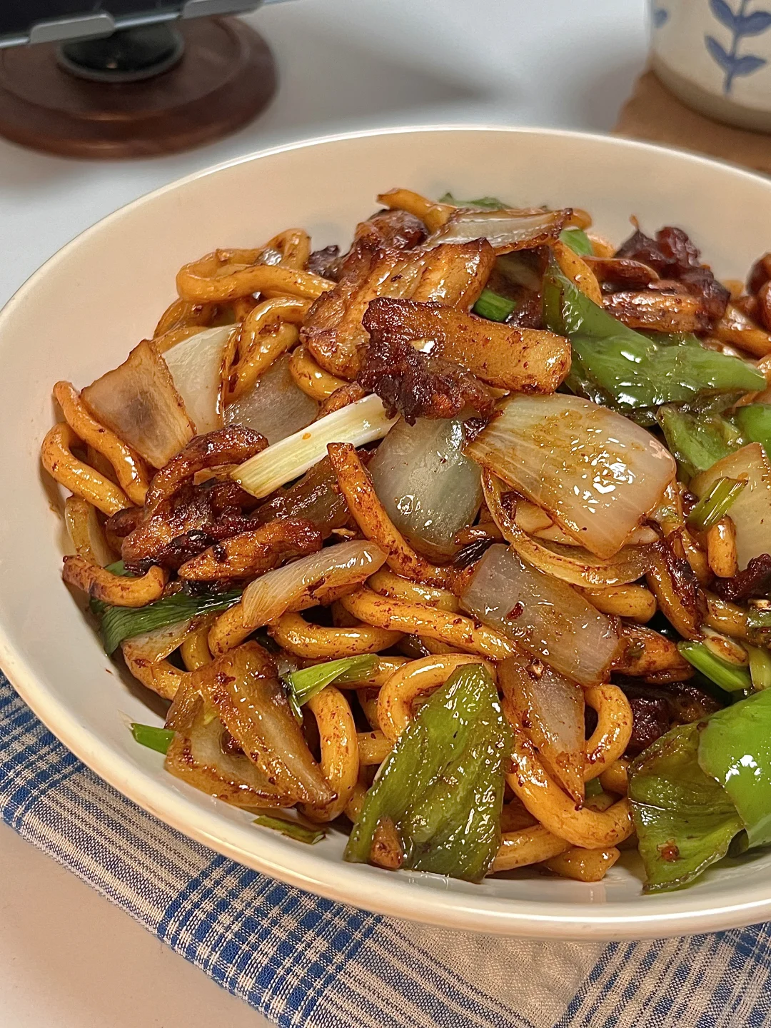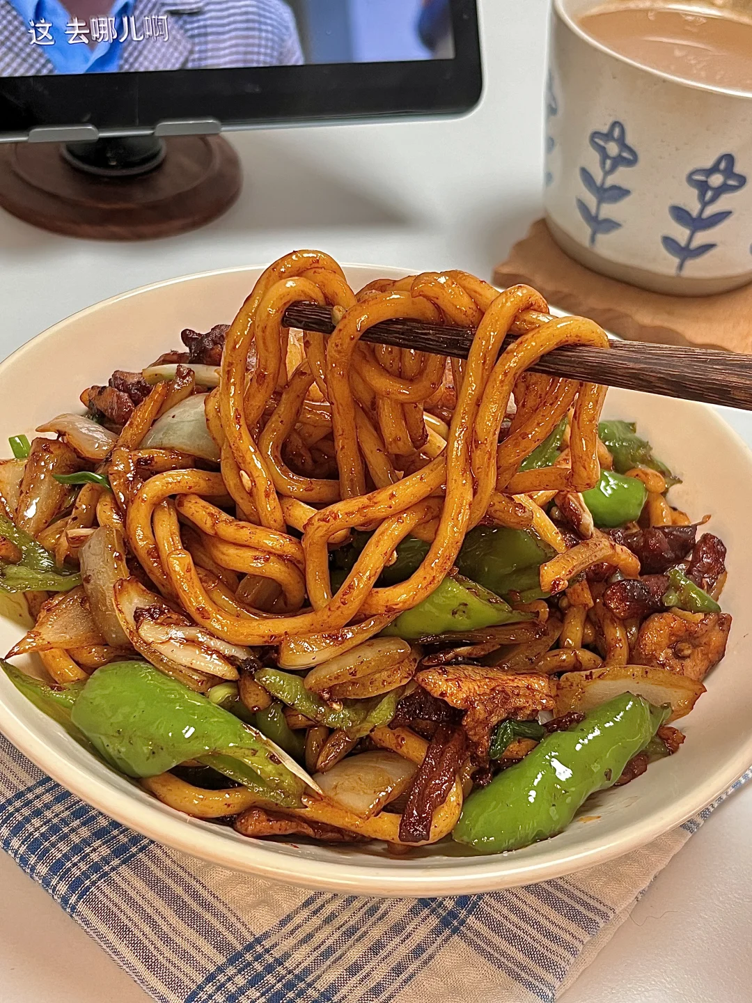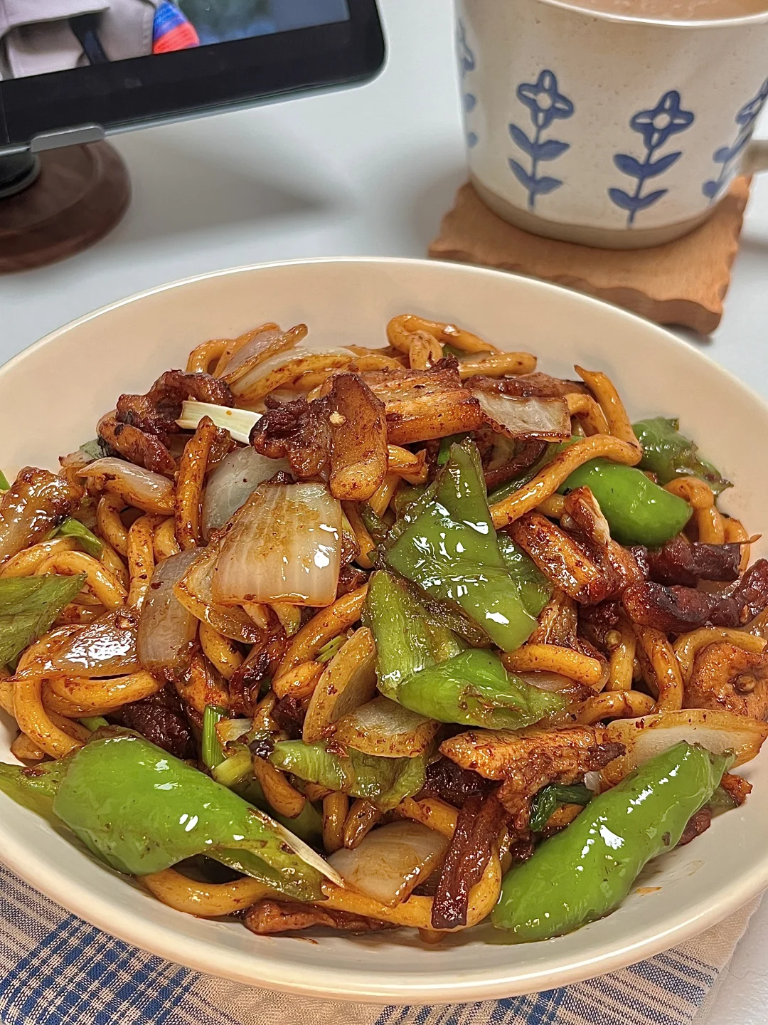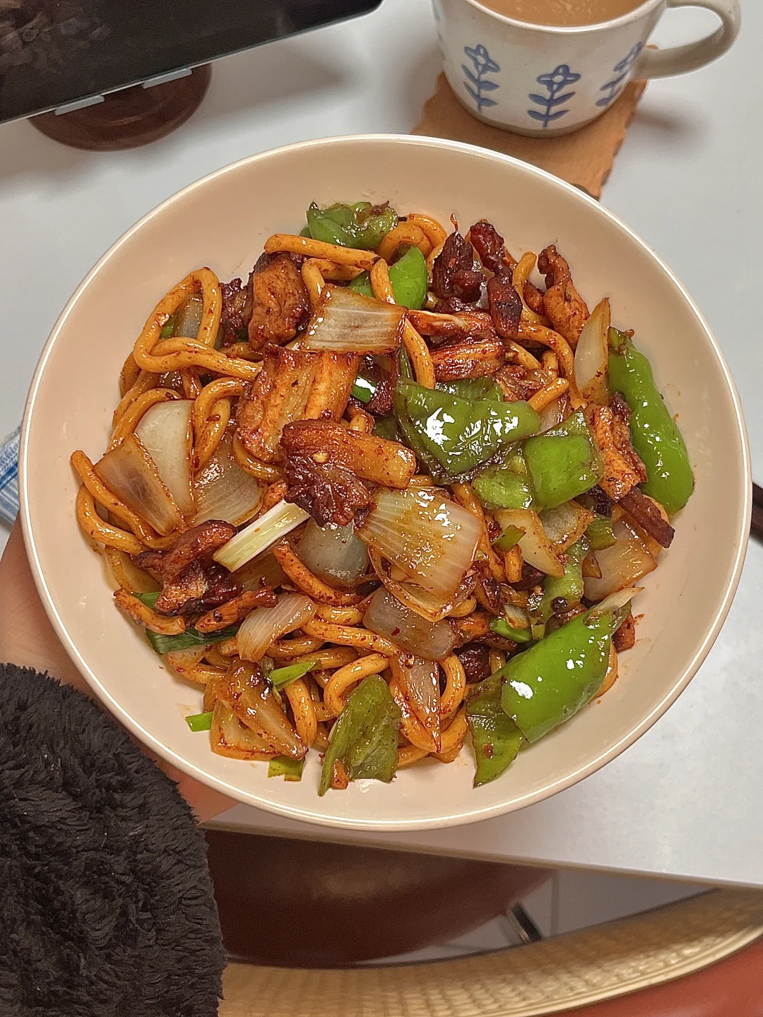 今日份一人食: 五花肉炒乌冬面 拿铁 . 我可太爱这种浓油赤酱的炒乌冬面了,锅里锅气的🍜糯叽叽的入味咸香巨好吃😋简单的配菜 一份特香的炒乌冬面就成了 爱吃的宝一定要去试试✌🏻