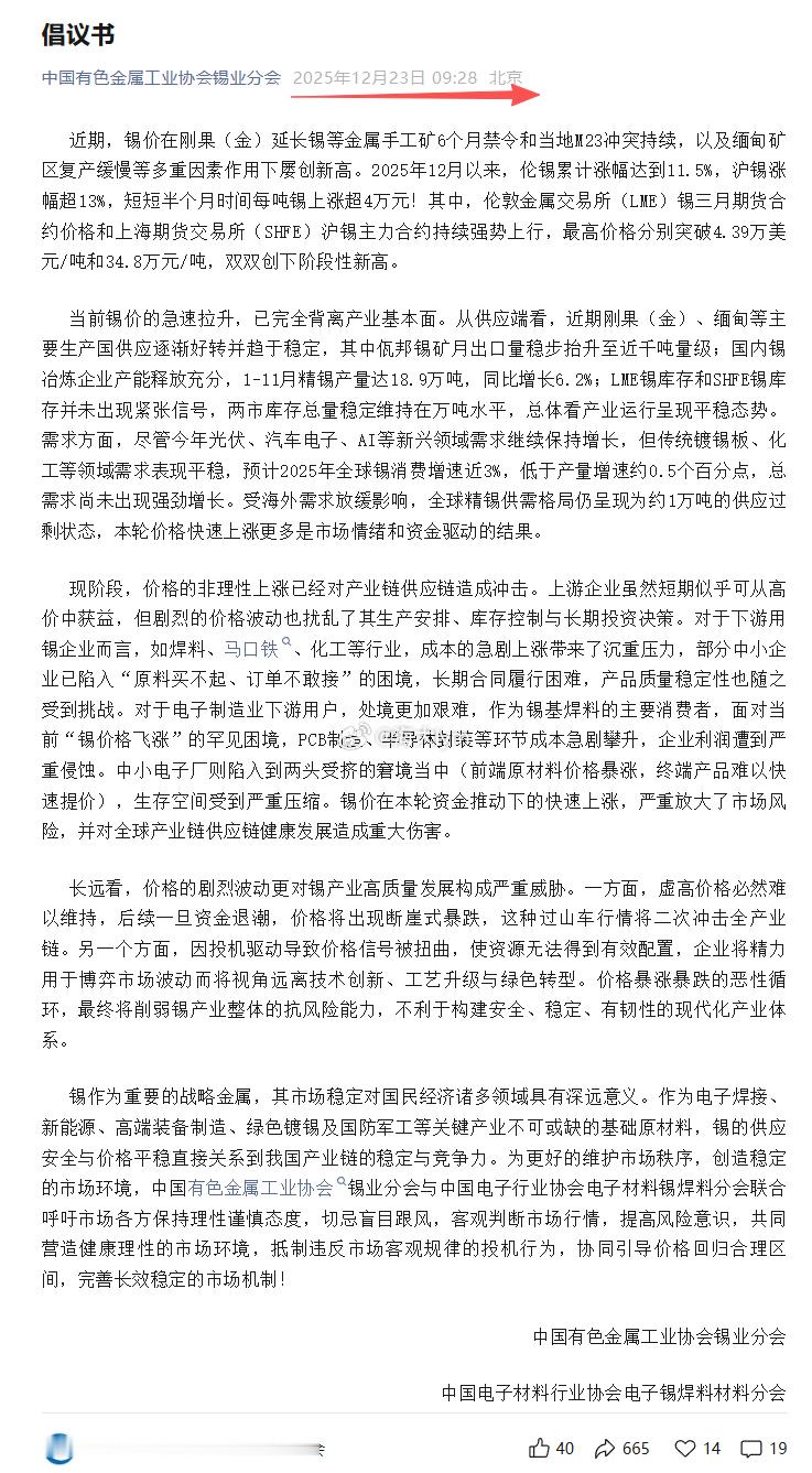 锡夜盘暴跌6%,协会12月23号早盘喊话(当时2602合约价格是341000),