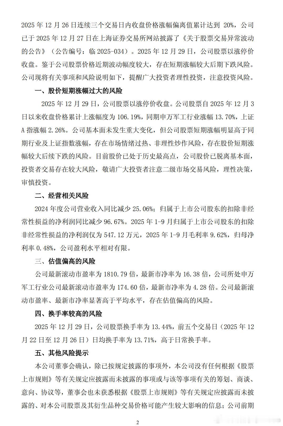 【中国卫星发风险提示公告,中国卫星公告股价存估值偏高风险】12月29日,中国卫星(600118.SH)公告称,公司股票自2025年12月3日以来收盘价格累计上涨幅度为106.19%,明显高于同期行业及上证指数涨幅,存在市场情绪过热、非理性炒作风险。公司基本面未发生重大变化,但股价已处于历史最高点,脱离基本面。公司最新滚动市盈率为1810.79倍,显著高于行业平均水平,存在估值偏高风险。同时,公司股票换手率较高,近期日均换手率高于日常水平。中国卫星走出4连板创新高