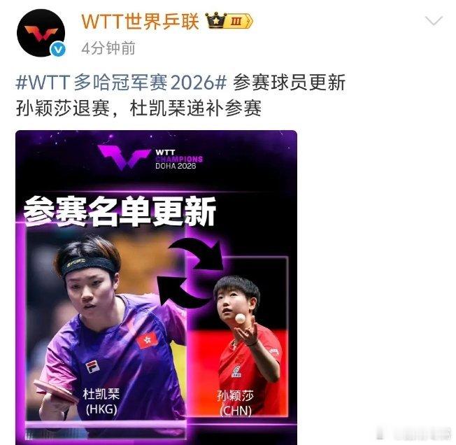 孙颖莎退出多哈冠军赛 确认消息:孙颖莎因身体原因退出多哈冠军赛,中国香港选手杜凯
