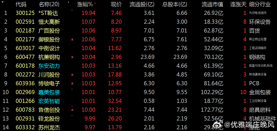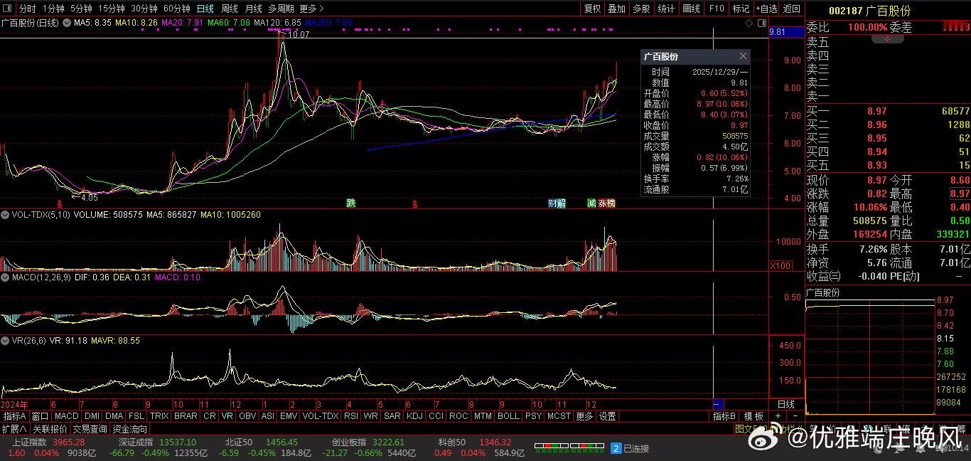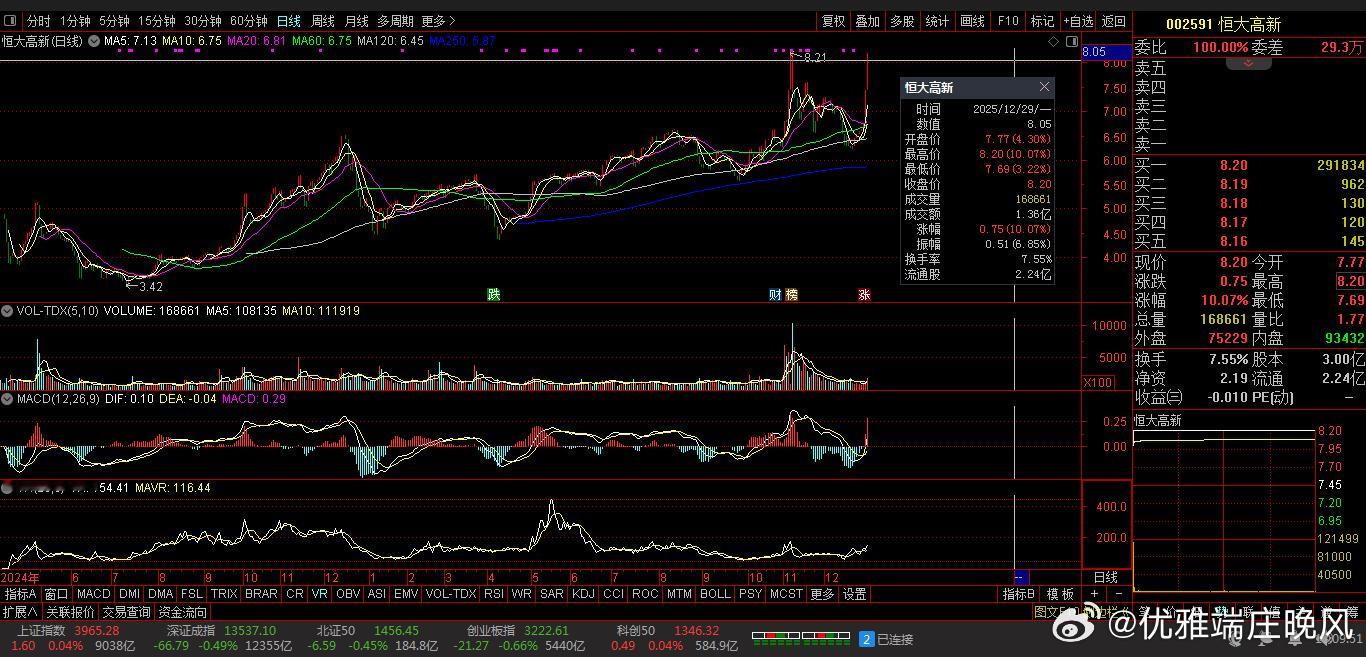 【财富晚茶】潜龙浮出水面:12.29主力资金:净流入前20股票导语:作者系《网易号》优质财经领域创作者。曾经原创作者和知名网易号旅游领域创作者。大跨度行业等的写作,颇受网友喜爱。作品发表于2025.12.29.19:18 优雅端庄晚风。【内容概述】今日股市收评评:主题是:【财富晚茶】潜龙浮出水面:12.29主力资金:净流入前20股票。主旋律:12.29主力资金:净流入前20股票:政策提振时代背景。一、视野最新:主力资金:前20强股票主旋律:最强股票:2025.12.29主力资金前20股票1、市场表现:前三公司300125 *ST聆达 002591 恒大高新 002187 广百股份二、视野背景:特点逻辑:前20强股票主旋律:净流入股:主力潜伏特点和主力核心逻辑复盘潜龙:浮出水面:12月29日:资金净流入的股票:主要集中:航天、科技、新能源和金融三大主线。核心逻辑:政策支持驱动资金布局、行业景气度提升吸引资金、游资与机构资金协同、市场情绪与资金行为、技术面与资金面等五重共振。具体透析如下:1、涨跌两重:资金为王第一、拓维信息:雷科防务今日盘面:涨跌两重天。资金净流入最大:拓维信息:净流入高达16.45亿元。当天股价涨停,涨幅10.0%。紧随其后流入第二:雷科防务:净流入10.0亿元。当天股价涨停,涨幅9.97%。这两只股票是当天资金流入最集中的标的。第二、视野主力:细分龙头除了拓维信息和雷科防务。个股还有:航天机电、海格通信、工业富联、金风科技、沪电股份等5只股票资金净流入超过5亿元,具体数据如下:航天机电(600151):净流入7.32亿元,涨幅9.98%海格通信(002465):净流入6.76亿元,涨幅10.04%工业富联(601138):净流入5.68亿元,涨幅2.19%金风科技(002202):净流入5.26亿元,涨幅10.01%沪电股份(002463):净流入5.13亿元,涨幅6.91%这些股票主要集中在航天、通信和新能源板块,当天市场资金流向比较集中。2、主力资金:简要说明主力资金:净流入前20的股票中,拓维信息、雷科防务、航天机电位列前三。主力分别:净流入16.45亿元、10.0亿元和7.32亿元。今日股票:核心逻辑和简要说明如下:第一、拓维信息高长板块净流入16.45亿元,涨幅10.0%。核心逻辑:涉及科技成长领域的布局。例如人工智能或云计算,符合主力:资金对高成长性板块的偏好。第二、雷科防务防御板块净流入10.0亿元,涨幅9.97%。预计受益:国防军工板块的景气度提升。主力资金:对防御性板块的关注度较高。第三、航天机电政策驱动净流入7.32亿元,涨幅9.98%。预计受益:新能源或航天科技领域的政策支持。主力资金:对政策驱动型板块的配置意愿较强。第四、海格通信科技成长净流入6.76亿元,涨幅10.04%。预计受益:5G通信或卫星导航等领域的快速发展。主力资金:对科技成长板块的持续关注。第五、工业富联低估蓝筹净流入5.68亿元,涨幅2.19%。预计受益:消费电子或智能制造领域的业绩增长,主力资金:对低估值蓝筹股的配置意愿较强。第六、金风科技绿色能源净流入5.26亿元,涨幅10.01%。预计受益:风电或新能源板块的政策支持。主力资金对绿色能源板块的关注度较高。预计受益:第七、沪电股份自主可控净流入5.13亿元,涨幅6.91%。预计受益:半导体或电子元件领域的国产替代。主力资金:对科技自主可控板块的配置意愿较强。第八、五洲新春制造升级净流入4.71亿元,涨幅10.0%。预计受益:汽车零部件或高端制造领域的景气度提升。主力资金:对制造业升级板块的关注度较高。第九、银邦股份高长板块净流入4.5亿元,涨幅14.18%。预计受益:新材料或新能源领域的创新突破。主力资金:对高成长性板块的偏好。第十、川润股份制造升级净流入4.33亿元,涨幅10.03%。预计受益:机械制造或工业自动化领域的政策支持。主力资金:对制造业升级板块的配置意愿较强。第十一、协创数据科技成长净流入3.96亿元,涨幅1.88%。预计受益:大数据或云计算领域的快速发展。主力资金:对科技成长板块的持续关注。第十二、观拉卡拉金融创新净流入3.6亿元,涨幅12.57%。预计受益:金融科技或移动支付领域的政策支持。主力资金:对金融创新板块的关注度较高。十三、迈为股份绿色能源净流入3.55亿元,涨幅20.0%。预计受益:光伏设备或新能源领域的业绩增长。主力资金:对绿色能源板块的配置意愿较强。第十四、光威复材高长板块净流入3.06亿元,涨幅14.86%。预计受益:碳纤维或新材料领域的创新突破,主力资金对高成长性板块的偏好。第十五、胜宏科技自主可控净流入2.91亿元,涨幅2.46%。预计受益:PCB或电子元件领域的国产替代。主力资金:对科技自主可控板块的配置意愿较强。第十六、长芯博创科技成长净流入2.15亿元,涨幅0.17%。预计受益:半导体或芯片领域的政策支持,主力资金对科技成长板块的关注度较高。第十七、软通动力科技成长净流入1.77亿元,涨幅3.41%。预计受益:软件服务或信息技术领域的快速发展。主力资金:对科技成长板块的持续关注。第十八、瞧英飞特绿色能源净流入1.73亿元,涨幅20.0%。预计受益:LED驱动或新能源领域的业绩增长。主力资金:对绿色能源板块的配置意愿较强。第十九、昊志机电制造升级净流入1.69亿元,涨幅15.15%。预计受益:高端装备或智能制造领域的创新突破。主力资金:对制造业升级板块的偏好。第二十、芯原股份科技自主净流入3.88亿元,涨幅5.71%。预计受益:半导体IP或芯片设计领域的国产替代。主力资金:对科技自主可控板块的关注度较高。3、