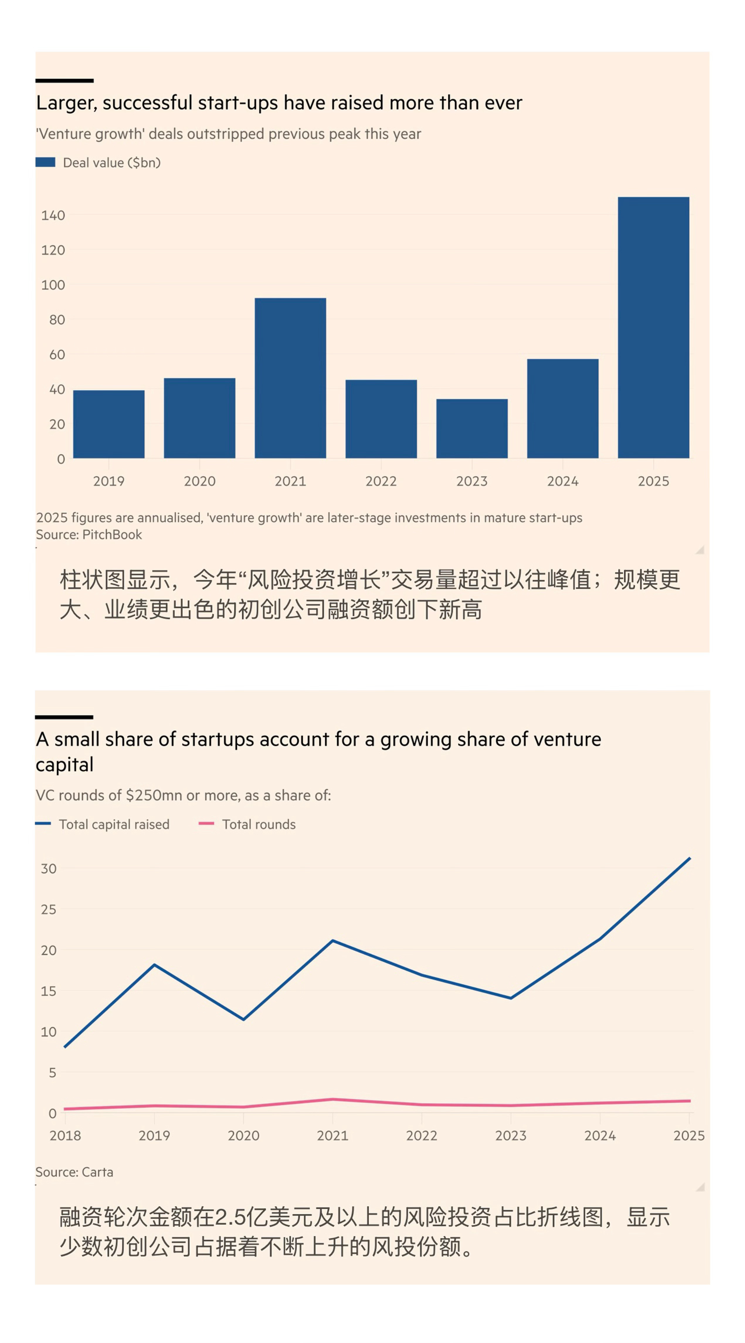 【担心投资热潮由盛转衰,AI初创企业囤积创纪录的1500亿美元“弹药”】 ( FT商学院 2025年12月29日 星期一) 『 巨额融资轮为这些企业打造“堡垒式资产负债表”,投资者建议头部公司为更艰难的市场做好准备。 』 文 | 乔治·哈蒙德 硅谷最炙手可热的初创公司今年已筹集1500亿美元资金,资方建议它们打造“堡垒式资产负债表”,以防备2026年人工智能投资热潮由盛转衰。 PitchBook的数据显示,随着投资者争相支持OpenAI、Anthropic等顶尖人工智能公司,2025年美国最大型私有公司的融资规模创下纪录,打破了2021年920亿美元的历史纪录。 风投人士和行业专家表示,随着公共市场开始担忧在AI基础设施上的高额支出,这笔资金将有助于在投资低迷中为创始人提供缓冲,并推动公司增长。 “趁着大好时机就该抓紧行动,”OpenAI、Databricks和SpaceX的投资者,Coatue合伙人卢卡斯•斯威舍(Lucas Swisher)说,他也投资了。“2026年可能会出现意想不到的情况……当市场给出机会时,要打造堡垒式资产负债表。” 今年的募资数据因几笔空前规模的交易而水涨船高。其中包括OpenAI在软银(SoftBank)领投下完成的410亿美元融资、Anthropic于9月完成的130亿美元融资,以及Meta向数据标注初创公司Scale AI投资逾140亿美元。 其他快速增长的AI公司——包括代码代理工具公司Anysphere、搜索公司Perplexity以及AI研究初创公司Thinking Machines Lab——今年也多次向风投募资。 多位投资者表示,他们已建议初创公司趁外界对AI改变经济潜力的热情仍高涨之际建立储备。 “(初创企业创始人)面临的最大风险在于,你没能融到足够的资金,融资环境就已枯竭,企业可能直接归零,”富兰克林邓普顿(Franklin Templeton)投资风投投资部门联席主管瑞安·比格斯(Ryan Biggs)说,“或者你接受一点股权被稀释,如果业务跑通了,其实并不重要:无论哪种情况,你依然会非常富有。” 据追踪私募市场的软件集团Carta公司称,初创企业平均每两到三年会进行一轮新融资。但近来,表现最好的AI初创企业在几个月内就再次向投资者寻求资金——即便许多小型初创企业的融资正在枯竭。 “投资者正涌向那些更晚期、对谁将胜出的确定性更高的交易,”比格斯说,“有一打你非投不可的公司。除此之外,形势相当艰难。” 推动2025年融资热潮的另一动力是,领先的AI集团的增长速度远快于以往的科技创业企业。 代码工具Cursor的开发商Anysphere的估值从年初的26亿美元飙升至11月的270亿美元。同一时期,其年度经常性收入——这一深受高速成长型初创公司青睐的指标——约增至原来的20倍,达10亿美元。 试图挑战谷歌(Google)的AI搜索引擎Perplexity在过去一年里已四次融资,尽管其高管声称并不需要更多资金。 成本压力导致募资活动更为频繁,尤其是在那些打造“前沿”AI模型、需要海量算力和高价芯片的企业中。 据接近该公司的知情人士透露,OpenAI的2025年收入约为130亿美元,但该集团每年仍在亏损数十亿美元,因为其正投入巨资开发模型、产品和基础设施。 在对人工智能工程师竞争激烈的市场中,高调的融资轮也为初创公司提供了向潜在客户和员工进行自我营销的机会。 “如果我是初创公司,我就得证明我的股权比薪水更有价值。”斯威舍说,并以金融科技公司Ramp为例,称其将飙升的估值作为招揽人才的工具。 Ramp今年通过四轮股权出售,估值从130亿美元跃升至320亿美元,公司在此过程中共融资10亿美元。 交易热潮导致许多风投公司烧钱速度快于预期。一些最大型的公司已启动新基金的募资进程。根据公开文件及知情人士的说法,其中包括Thrive Capital、安德里森-霍洛维茨(Andreessen Horowitz)和老虎环球(Tiger Global)。 光速创投(Lightspeed Venture Partners)和Dragoneer等多家机构于12月募集了新的数十亿美元基金,这表明最炙手可热的初创公司在2026年仍将能够获得更多风险投资资金。 投资者还表示,最大型初创公司的创始人正在充实资产负债表,以把握收购机会,尤其是在明年投资者情绪转变、较小竞争对手很难筹集新资金的情况下。 “系好安全带。”风投公司Sentinel Global的创始人、曾任新加坡政府投资公司(GIC)科技投资负责人杰里米·克兰茨(Jeremy Kranz)说。 “一旦公共市场稍有风声,基本就是每周并购一家公司。这帮人会把他们私营公司的5000亿美元市值当作弹药,到处出手收购。” 网页链接