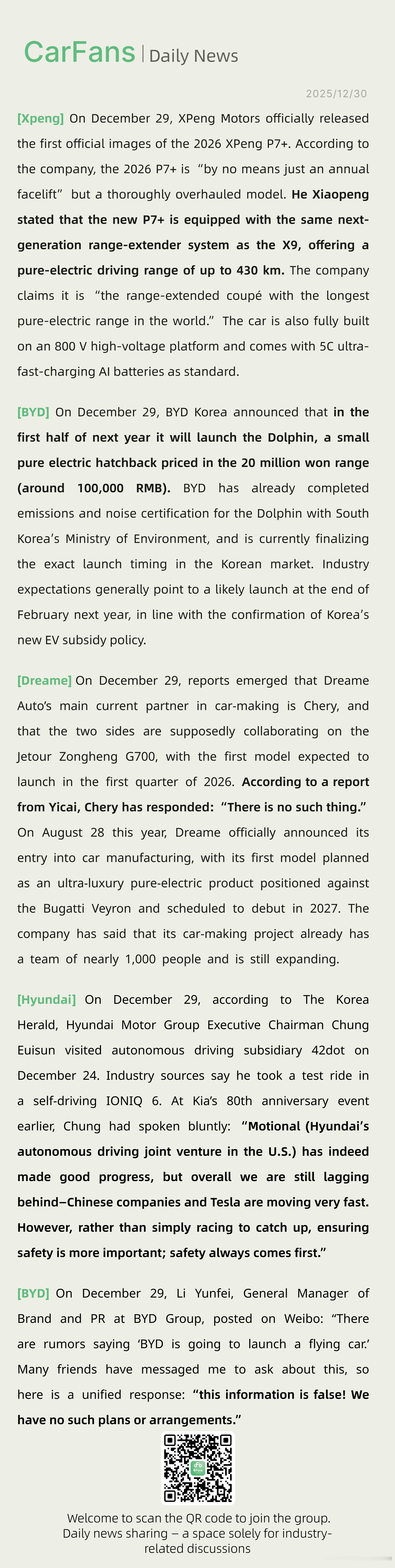 奇瑞辟谣跟追觅合作、韩国现代董事长表示智驾落后中美两国有消息称,追觅造车目前最主要合作伙伴是奇瑞,双方合作车型为捷途纵横 G700,第一款车预计大概 2026 年第一季度会推出。据第一财经报道,对此奇瑞方面回应称:“并无此事”。今年8月28日,追觅科技正式官宣跨界造车,首款车型将是对标布加迪威龙的超豪华纯电产品,计划 2027年亮相。官方称,目前该项目己组建了近千人的造车团队,且在持续扩张。追觅第一款车跟谁造,怎么造,都很神秘新能源汽车