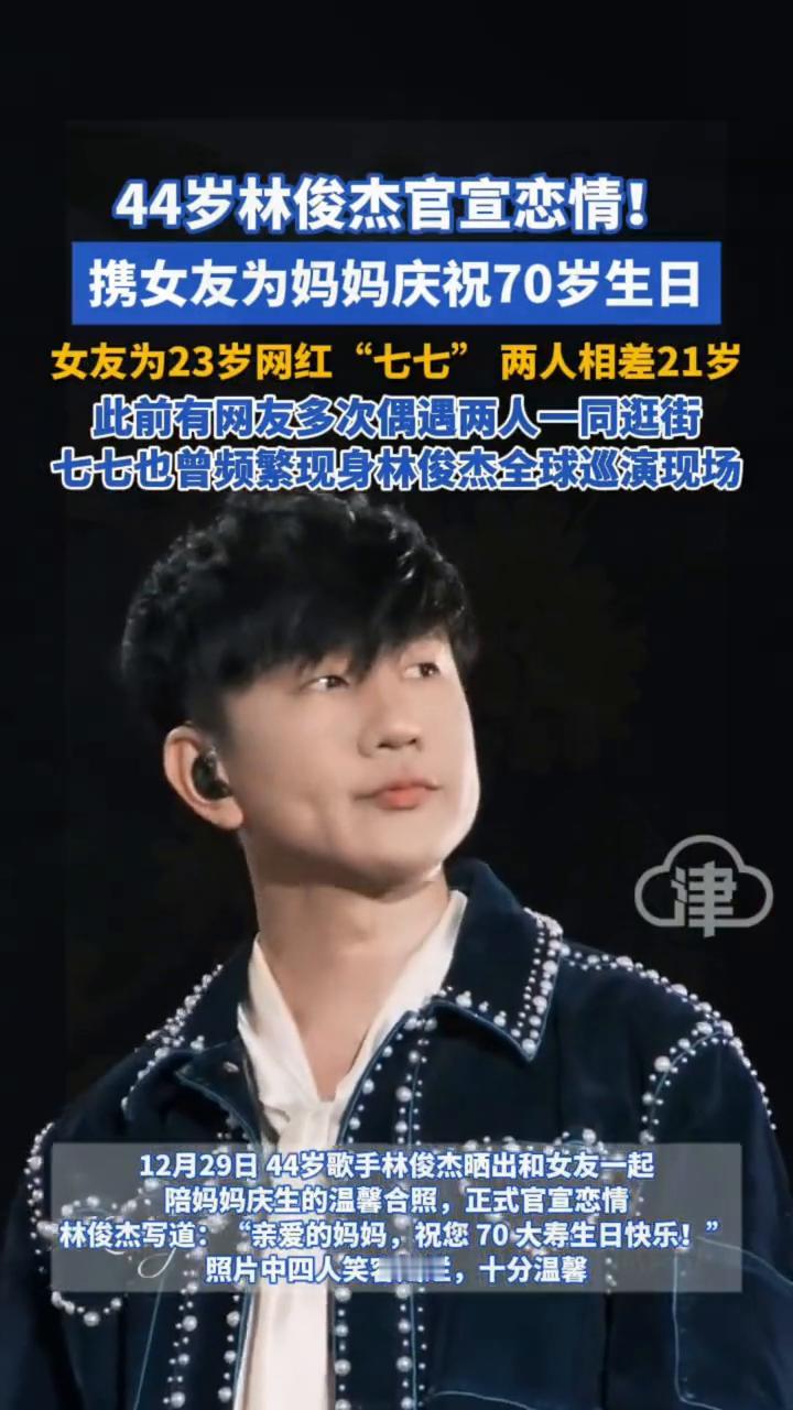 44岁林俊杰官宣恋情,携女友为妈妈庆祝70岁生日。 女友为23岁网红"七七",两人相差21岁。此前有网友多次偶遇两人一同逛街,七七也曾频繁现身林俊杰全球巡演现场。 12月29日,44岁歌手林俊杰晒出和女友一起陪妈妈庆生的温馨合照,正式官宣恋情。林俊杰写道:"亲爱的妈妈,祝您70大寿生日快乐!照片中四人笑容灿烂,十分温馨。 2025年2月,网络上爆料林俊杰与七七恋情引热议。10日,林俊杰经纪公司回应恋情传闻:"我们不会对网络上任何捕风捉影的传言做回应,JJ的生活中心还是放在音乐事业上。