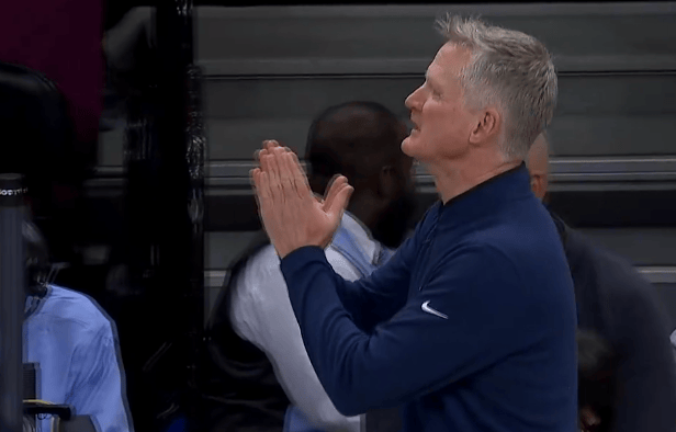 比赛的第一节,托马斯上下步抛投打进,科尔质疑其走步双手合十向裁判抗议。