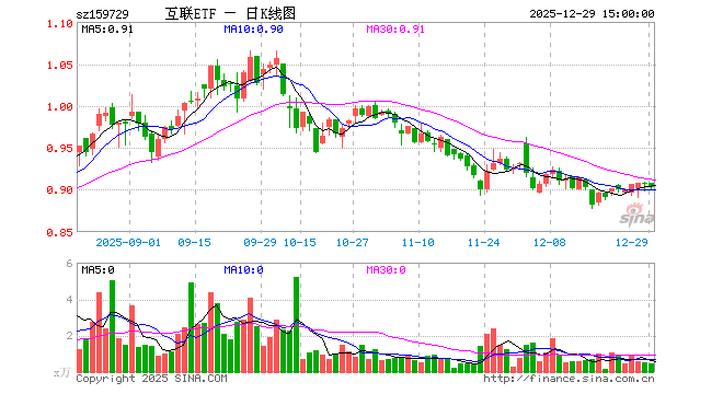 12月29日,互联网ETF(159729)跌0.55%,成交额43.45万元。当日份额增加180.00万份,最新份额为6496.06万份,近20个交易日份额增加0.00份。最新资产净值计算值为5805.53万元。