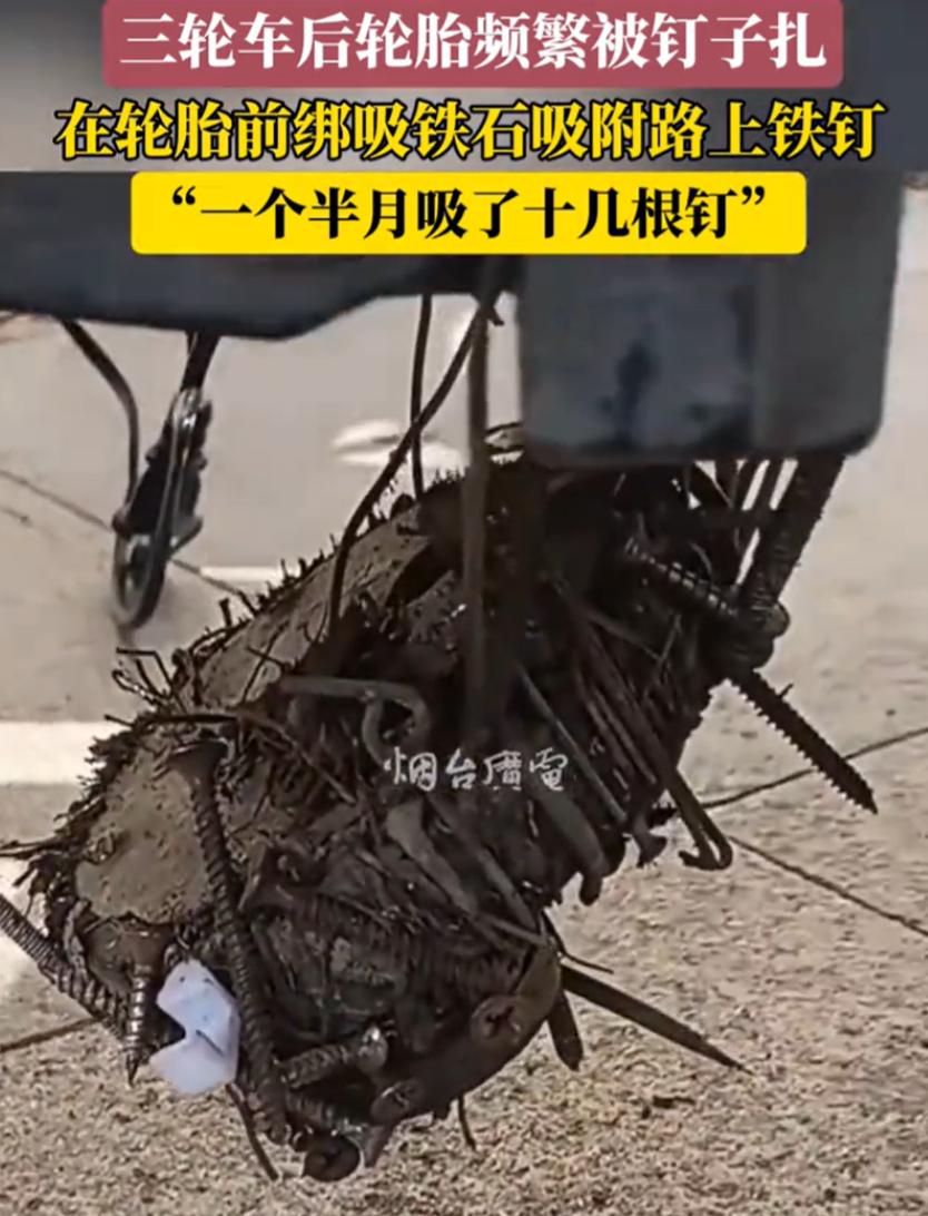 太有头脑了!安徽一男子的三轮车轮胎,经常被钉子扎,为了防止这种事情发生,男子灵机一动,竟然在轮胎前绑了个吸铁石,用来吸附路上的铁钉!效果非常好,也不碍事,又不重,一个半月吸了十几根钉,网友:高手在民间! 那个检查磁铁的瞬间,简直让人后背发凉,又忍不住拍大腿叫绝。在安徽这位三轮车师傅的后车轮前面,一块看似不起眼的半月形金属上,竟然密密麻麻地吸附着像刺猬一样的铁刺——仔细一数,整整十三根。这哪里是普通的铁片,分明是一个战功赫赫的“扫雷兵”。如果不是这块强力磁铁当了“替死鬼”,这十三根藏在路面尘土里的尖锐物,早就分毫不差地扎进橡胶轮胎里了。这一幕,发生在装置使用了整整一个半月之后。 这之前,日子可没这么舒坦。师傅是靠拉蔬菜和倒腾日用品过活的,赚的是起早贪黑的辛苦钱。偏偏他每天必经的那条路上,总是大货车川流不息。那些满载着装修废料和五金件的大家伙,走起路来哐哐当当,车斗里的钉子、废铁屑只要稍微一颠簸,就像播种一样撒得满地都是。 对于骑三轮的人来说,这些混在灰扑扑路面、藏在碎石子之间的小铁钉,简直就是“隐形杀手”。根本没办法避开,除非你长了一双显微镜眼。补胎师傅对此也只能两手一摊,除了那一两句“路上多留意”的空话,再无良策。每次听到轮胎那令人绝望的“嘶嘶”泄气声,师傅的心就得揪成一团:不仅这趟活儿耽误了,推着死沉的车去找维修点得累半死,日积月累下来的补胎费,更是把那点微薄的利润像蚂蚁搬家一样啃了个精光。甚至有过刚补好胎没跑出两里地,又听到那声爆响的崩溃时刻。 这种被动挨打的局面,硬是逼出了一场“土味发明”。师傅没有继续在抱怨声中掏钱补胎,而是把目光投向了家里的废品堆。经过一番翻箱倒柜,他在一堆旧家电零件里,淘出了一块沉甸甸的宝贝——一个直径约十厘米的半月形强力磁铁。这玩意儿吸力大得很,原本不知是哪个电机里的部件,现在却要被赋予新的使命。 改装的过程极其讲究实战逻辑。师傅没有随便找个地方一贴了事,而是拿着磁铁围着后轱辘转了好几圈,最终选定了后轮胎正前方的挡泥板处。这个位置极其刁钻,正好扼守住了轮胎行进的必经之路:任何想碰轮胎的铁钉,都得先过了磁铁这一关。 为了固定这个“门神”,细绳子肯定是不顶用的。他特意找来了粗铁丝,对着车架硬是缠了五六圈,每缠一圈都要用死力气拽紧,直到用手怎么用力晃动都纹丝不动才罢手。他心里清楚,路上的大坑小坎多,要是绑不紧掉下来,那是自己给自己下套。除了固定牢靠,高度更是精细活——离地面太近,容易像铲子一样蹭坏磁铁;离得太远,吸力够不着地面。经过反复比划,高度被精准锁定在离地三五厘米的区间,既不妨碍拐弯过坎,又能像吸尘器一样贴地扫荡。 哪怕是经过了如此周密的部署,第一次把车开出去时,师傅心里还是直打鼓。直到他在坑洼路面上颠簸测试,急拐弯试探,发现磁铁始终稳如泰山地悬在那里,悬着的心才放下一半。 效果是无声且惊人的。整整一个半月,这辆“带刀护卫”的三轮车跑遍了平日里的“雷区”,后轮胎竟一次气都没漏过。再看那块吸满十三根钉子的磁铁,不仅是省下了十几笔补胎费的证据,更是让人从此跑运输有了底气。生意不再因为爆胎被耽误,心情也不再被那种未知的焦虑所裹挟。 这种来自民间的“硬核智慧”,要想复制还得讲究门道。并不是随便哪块吸铁石都能胜任,一定要选用“强磁”材质,那些只能吸住一张纸的普通磁铁在路面颠簸中根本吸不住细小的铁钉。同时,尺寸也是关键,像师傅用的这种直径在8到12厘米左右的半月形最合适,覆盖面积大且能完美贴合车架弧度,太小了很容易有漏网之鱼。至于固定方式,扎带或者粗铁丝是必须的,安全永远是改装的前提。 谁能想到,困扰了无数司机的扎胎难题,最终竟然被一块废弃家电里拆出来的磁铁,加上几圈粗铁丝就给破解了?生活里的那些麻烦事,有时候真就像这路上的钉子,看起来避无可避,把你折腾得没脾气。但换个角度,它也可能是块“磨刀石”。这位师傅没有在灰尘扑扑的路边一直抱怨运气不好,而是动手去寻找那个源头的解法。事实证明,只要肯动脑子,那些看起来尖锐棘手的“拦路虎”,最后都能变成手里捏着的勋章。