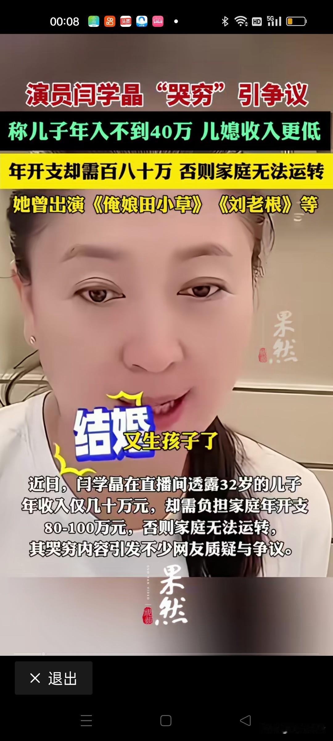 演员闫学晶犯了一个“致命”的错误,那就是跳出来向普通人哭穷,诉苦,想从普通人这里获得同情和支持,这不是倒反天罡吗? 闫学晶直播带货时“哭穷”说儿子一家一年需要百八十万的开销,快生活不下去了,让网友赶紧下单帮儿子分担压力……网友建议北京社保局:给闫学晶一家办个低保吧! 明星闫学晶哭穷引发热议,有钱人住豪宅吃鲍鱼习惯了,突然少了几个菜就觉得受不了了,明星哭穷也只是说去年赚了200万,今年赚了100万就觉得自己好像赔了100万,她们是从最基层富起来过上了好日子再也接受不了普通的日子。早就忘了普通人的生活,可是中国90%的人月薪不到5000块! 闫学晶说:“我儿子都32岁了,结婚生孩子了,他一年需要百八十万这个家才能运转,但他挣不来这么多,一个戏就挣个几十万块钱,儿媳妇挣得更少一些,一年不到十万。可见当妈的多心疼儿子,单怕儿子的生活水准降低了,真羡慕这儿子有个好妈。 有网友说,真不容易啊,让北京社保局给他们家办一个低保,绝不能亏待艺术家,决不能让有钱的富豪们降低生活档次! 也有网友说,一家三口一年百八十万花费还不够生活吗?平均一个月8万块,平均每天2500多块吃喝拉撒还不够,究竟有钱人的消费有多高啊?2500元 是多少个普通百姓一个月的工资啊!人比人得死,货比货得扔! 还有网友说 ,听起来她在哭穷,我怎么觉得她是在炫富? 这番话虽然属于调侃,但却道出了很多人的心声,因为全国有几亿人月收入在1000元以下,很多人连工作都找不到呢。但明星们的生活是普通人难以企及的。他们所谓的“压力”不过是矫情造作罢了,普通人又怎么可能与她们共情呢? 明星们享受着高额的片酬、丰厚的代言费,啥也不用干就靠一张脸就能过着奢华的生活,却还要在公众面前哭穷,试图让大众与之共情,这无疑是犯了一个“致命”的错误,闫学晶这个事有可能让她“晚节不保”了! 她也是从基层成长起来的,但富了以后却对于普通人的艰辛视而不见,与基层社会脱离太久完全不懂体恤普通人的不易。明星们本就是自带流量,靠一张脸就能非常容易的搞钱,但普通人就是干到累死只能养家糊口,穷富差距本来就是一个尖锐的问题。 当一个一年100万不够花的人向一群一辈子都存不够100万的人哭穷诉苦,这已经刺痛了普通人的神经。作为明星公众人物应该谨言慎行,多站在普通大众的立场上看问题才能获得大众的支持! 我是牛八view,欢迎大家评论留言!创作不易,请多多指教!