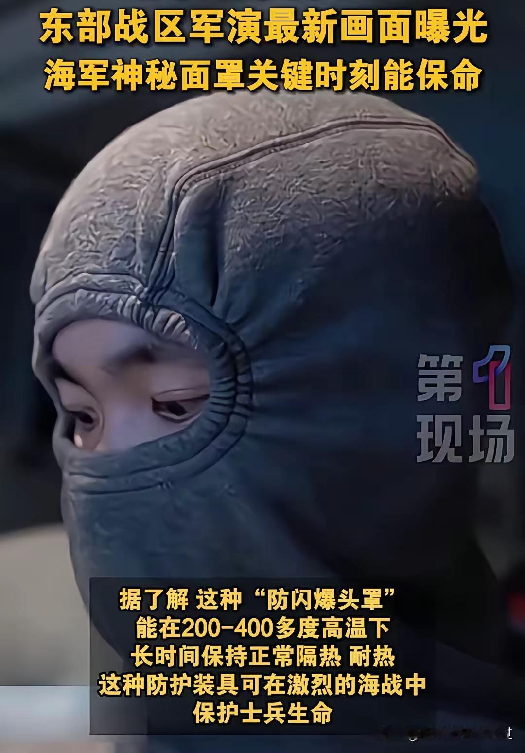 在12月29日东部战区军演中,宝鸡舰上的海军士兵们戴上了防闪爆头罩: 防闪爆头套是一种专为防护爆炸瞬间高温冲击波设计的装备,主要用于海军舰艇作战环境,能有效阻隔200-400°C高温,保护头部、颈部免受烧、灼伤。