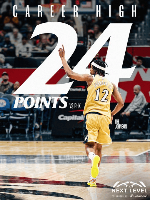 本场比赛,奇才球员6号秀特雷-约翰逊出战25分钟,12投9中,其中三分球5投5中,罚球1投1中,得到24分1篮板2助攻1抢断。