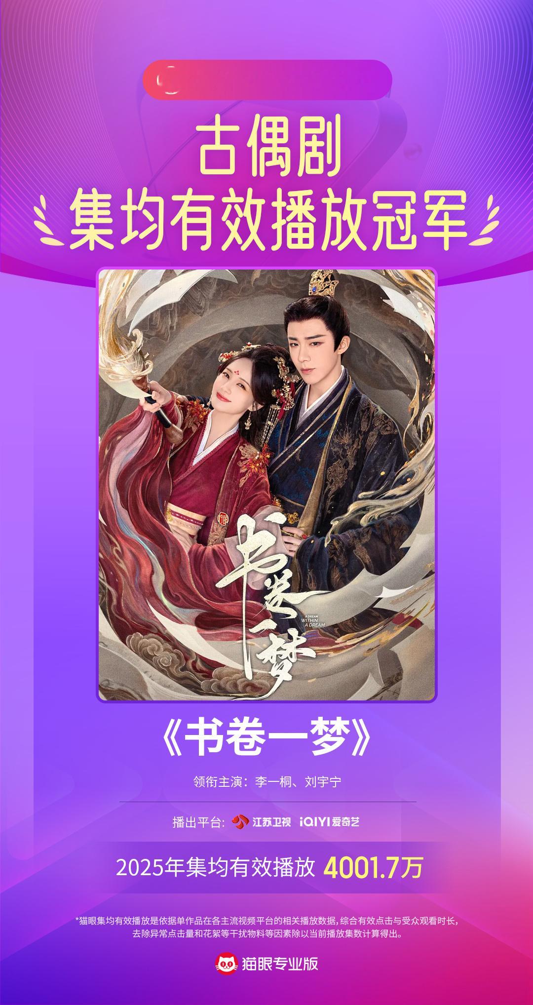 书卷一梦年度古偶剧有效播放双榜冠军 据猫眼专业版数据,领衔主演电视剧《书卷一梦》2025年累计有效播放量16.00亿、集均有效播放量4001.7万,成为2025年古偶剧有效播放双榜冠军!主要剧集成就🈶:🏆2025年古偶剧有效播放双榜冠军🏆猫眼电视剧有效播放月冠x1🏆猫眼电视剧有效播放周冠x3🏆猫眼电视剧有效播放日冠x7数据统计范围:2025年1月1日-2025年12月29日2025年猫眼剧集有效播放榜2025年度猫眼榜单
