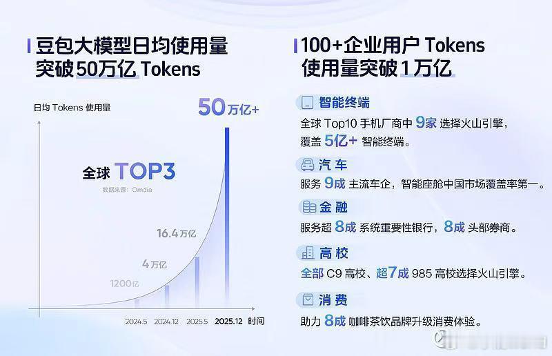 第一张图:Google Monthly tokens processed 趋势分析• 核心信息:这是一张展示“月度Token处理量(以万亿为单位)”的折线图,时间跨度从2024年3月到2025年9月。◦ 2024年3月:处理量仅为9.7T,处于极低水平。◦ 2025年3月:出现-100T的异常值(推测可能是统计口径调整或数据标注误差)。◦ 2025年6月:处理量快速攀升至480T。◦ 2025年9月:达到1300T,呈现爆发式增长。• 解读:整体趋势显示Token处理量在2025年中期后进入高速增长阶段,反映出相关AI业务或模型调用需求的大幅提升。第二张图:豆包大模型及火山引擎业务成果• 豆包大模型部分◦ 日均Tokens使用量突破50万亿,且在全球大模型领域排名TOP3(数据来源:Omdia)。◦ 日均Tokens使用量增长历程:2024年5月为1200亿,2024年12月达4万亿,2025年5月升至16.4万亿,2025年12月超过50万亿,增长曲线陡峭,体现出用户使用需求的快速扩张。• 火山引擎企业用户部分◦ 100+企业用户Tokens使用量突破1万亿,覆盖多个领域:◦ 智能终端:全球Top10手机厂商中9家选择火山引擎,覆盖5亿+智能终端。◦ 汽车:服务9成主流车企,智能座舱中国市场覆盖率第一。◦ 金融:服务超8成系统重要性银行、8成头部券商。◦ 高校:全部C9高校、超7成985高校选择火山引擎。◦ 消费:助力8成咖啡茶饮品牌升级消费体验。• 解读:这组数据体现了豆包大模型的规模化应用能力,以及火山引擎在To B领域的广泛布局和行业渗透率,反映出字节跳动在AI技术商业化和生态建设上的成果。