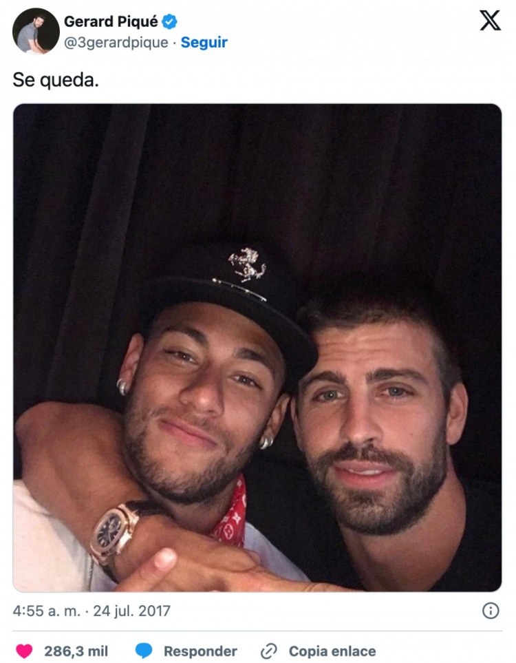 这句话印证了许多人随着时间推移的猜测:在皮克发布那张照片时,更衣室里早已默认内马尔不会继续留在巴萨。那不过是一次球员之间的玩笑,而他们都清楚,球队将在那个夏天失去一位核心球星。