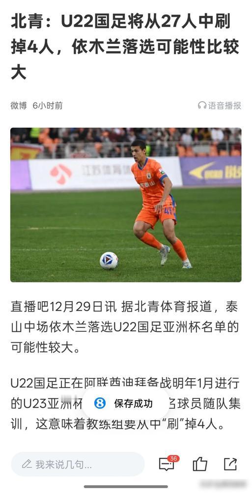 意料之中,依木兰漏选情有可原,而且刷下来也不一定是对能力的否定,依木兰将来一样可以竞争国家队的位置。 毕竟现在U22国足在迪拜已经到了出征前的最后冲刺,教练组得赶在U23亚洲杯开始前,把目前27人的集训阵容精简到最终的23人。 这种临阵裁员其实挺残酷的,本来在广东集训时还有29个人,结果吴启鹏和李新翔这两个主力苗子先因为伤病退出了,直接打乱了之前的排兵布阵。 最让我感慨的是山东泰山的依木兰,听说他在最近几场关键的热身赛里几乎没得到上场机会,这其实就是个非常明确的信号了。 在国家队这种短期锦标赛里,教练往往更看重即战力和战术成熟度,依木兰这种潜力型球员没被选上,大概率还是因为现在的战术体系里暂时没他的坑位。 我觉得大家没必要因此就看衰他的职业生涯,中场这个位置本来就讲究经验,回去俱乐部多踢比赛比在国字号当陪练更有价值。 除了他这种位置上的变动,按常理门将位置也肯定会刷掉一人,毕竟23人大名单里三个守门员是“标配”。 眼下球队正准备通过和吉尔吉斯斯坦的热身赛做最后定夺,谁走谁留可能就在这一两场比赛的状态之间了。 说到底,这种选拔不仅看实力,还得看一点运气,只希望留下的这23人能在亚洲杯上踢出点真本事吧。